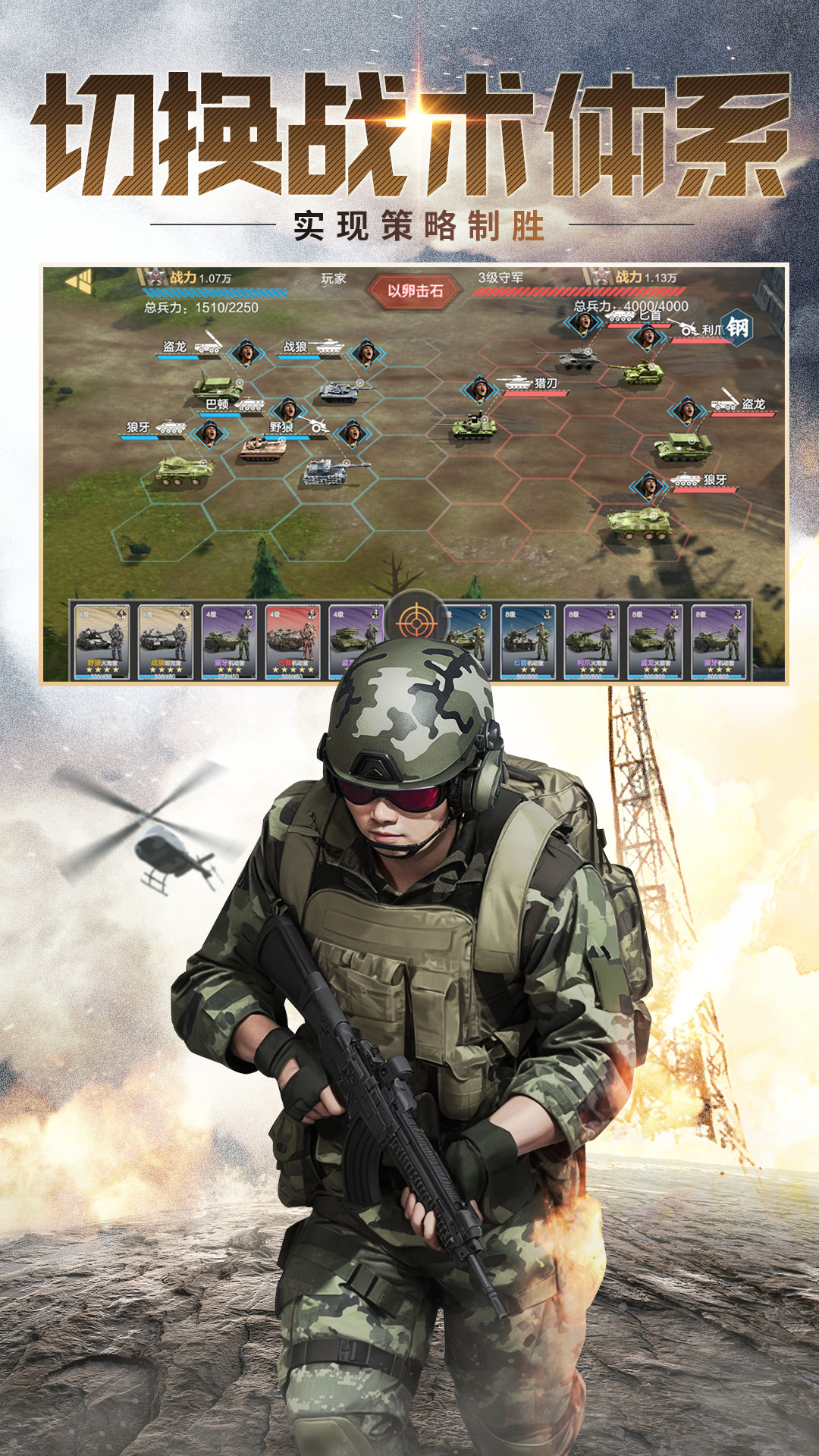 随时切换战术体系,根据部队特色调整编队。通过羁绊玩法和升级部队部件、技能,分别侧重强化部队的火力、防御或指挥属性,实现策略致胜。