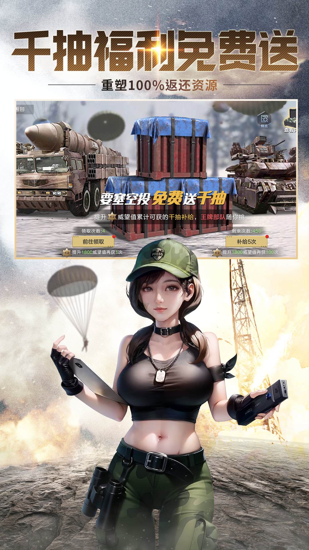 开局就要爽,千抽福利免费大放送,空投1000次抽卡补给!进阶资源多到爆,王牌部队任你挑!