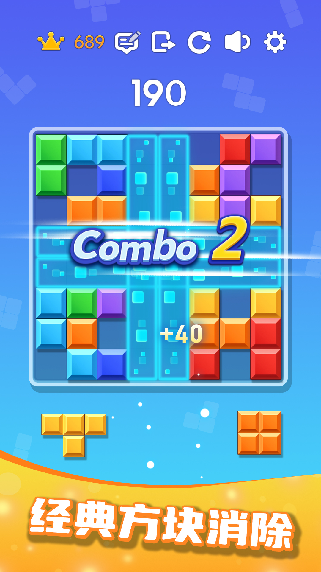 玩法:将不用颜色的方块拖入上方位置,一行或一列铺满即可消除