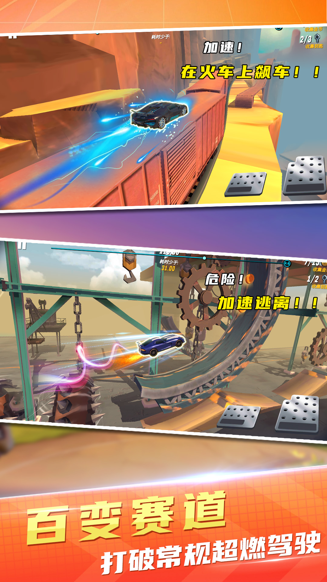 -小心!危险逼近!破坏力十足的铁锤迎面袭来、高速行驶的火车在背后穷追不舍,仿佛置身于刺激的赛车动作大片里,每一秒都是生死时速!驾驶赛车甩开危险,一起感受肾上腺素狂飙的快乐吧!