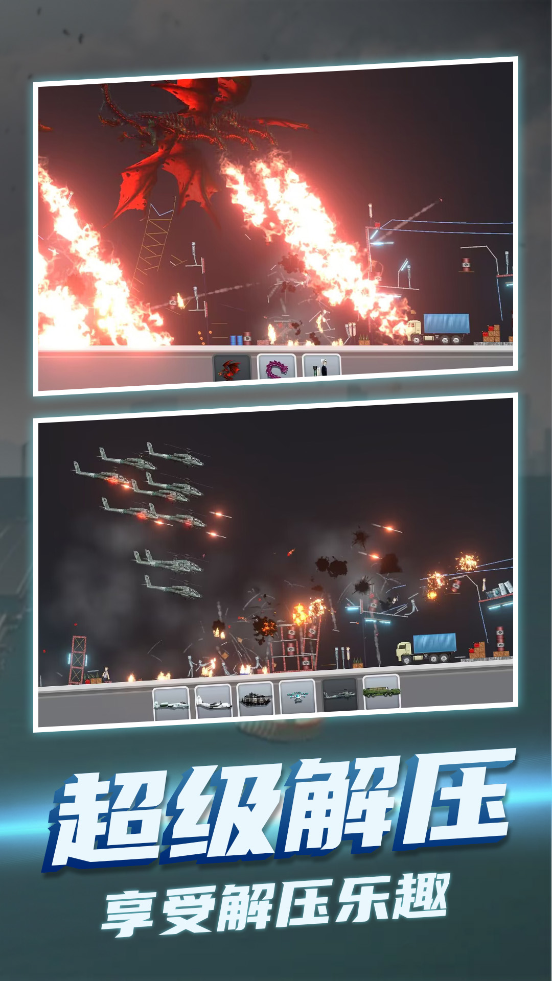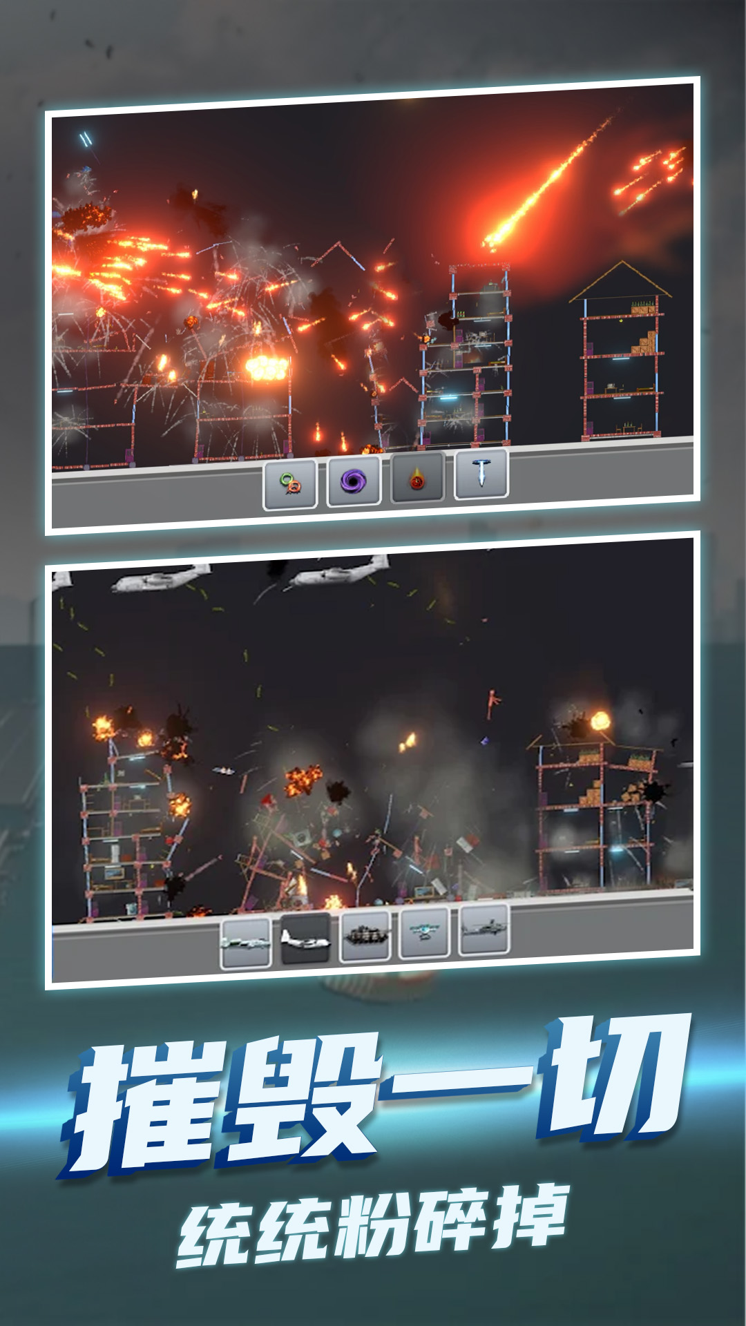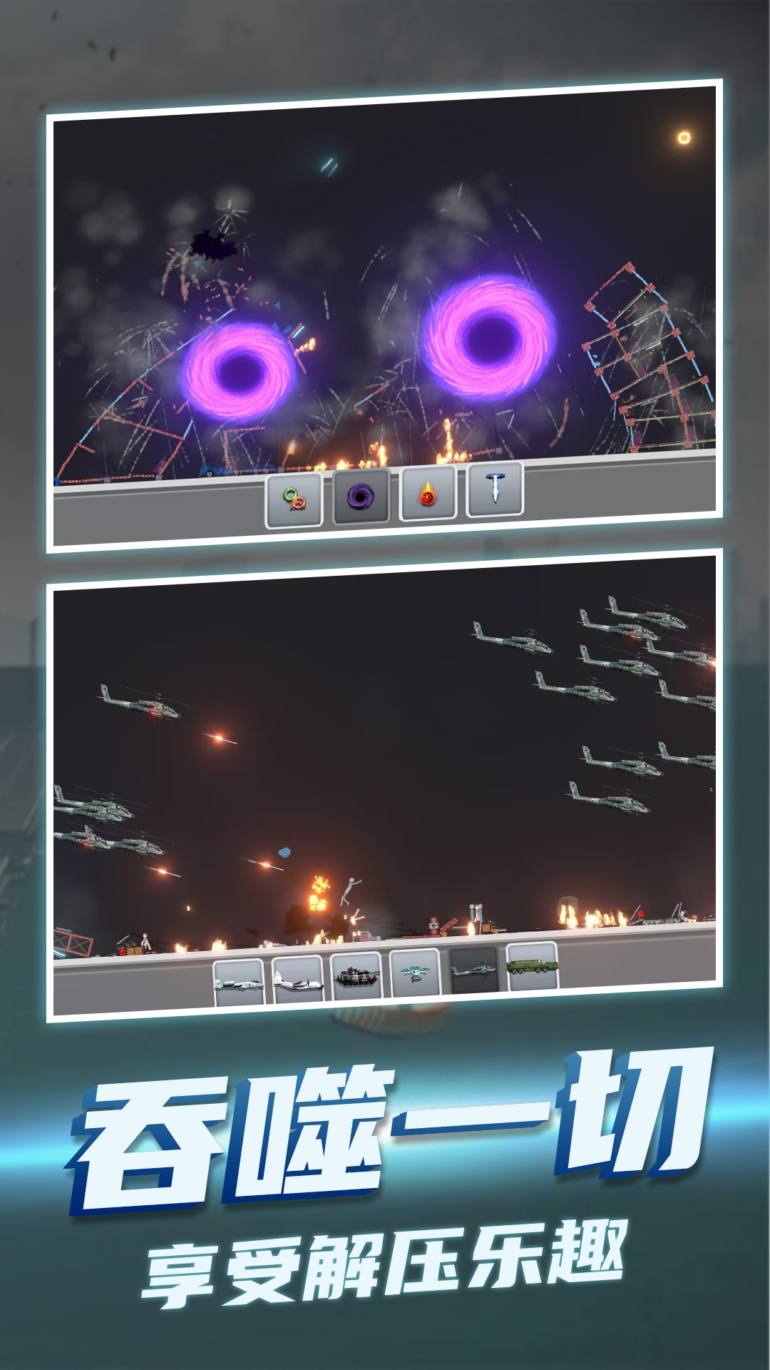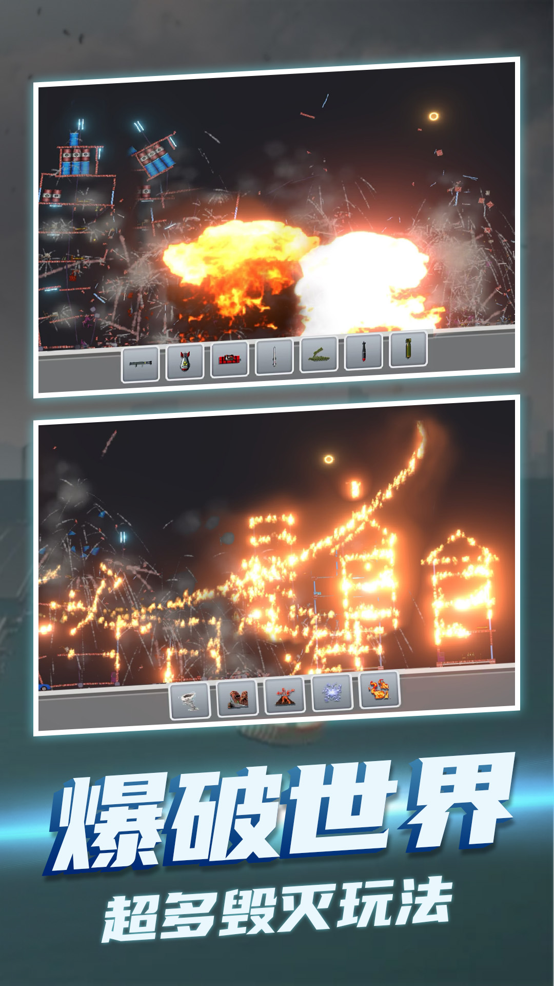 《模拟失控城市》是一款相当具有战斗感的模拟游戏,多种不同的游戏道具和技能在这里都可以直接的展现出自身的战斗性能,合理的使用道具可以更好的体验解压的爆破感,体验粒子特效爆炸的爽快感受。