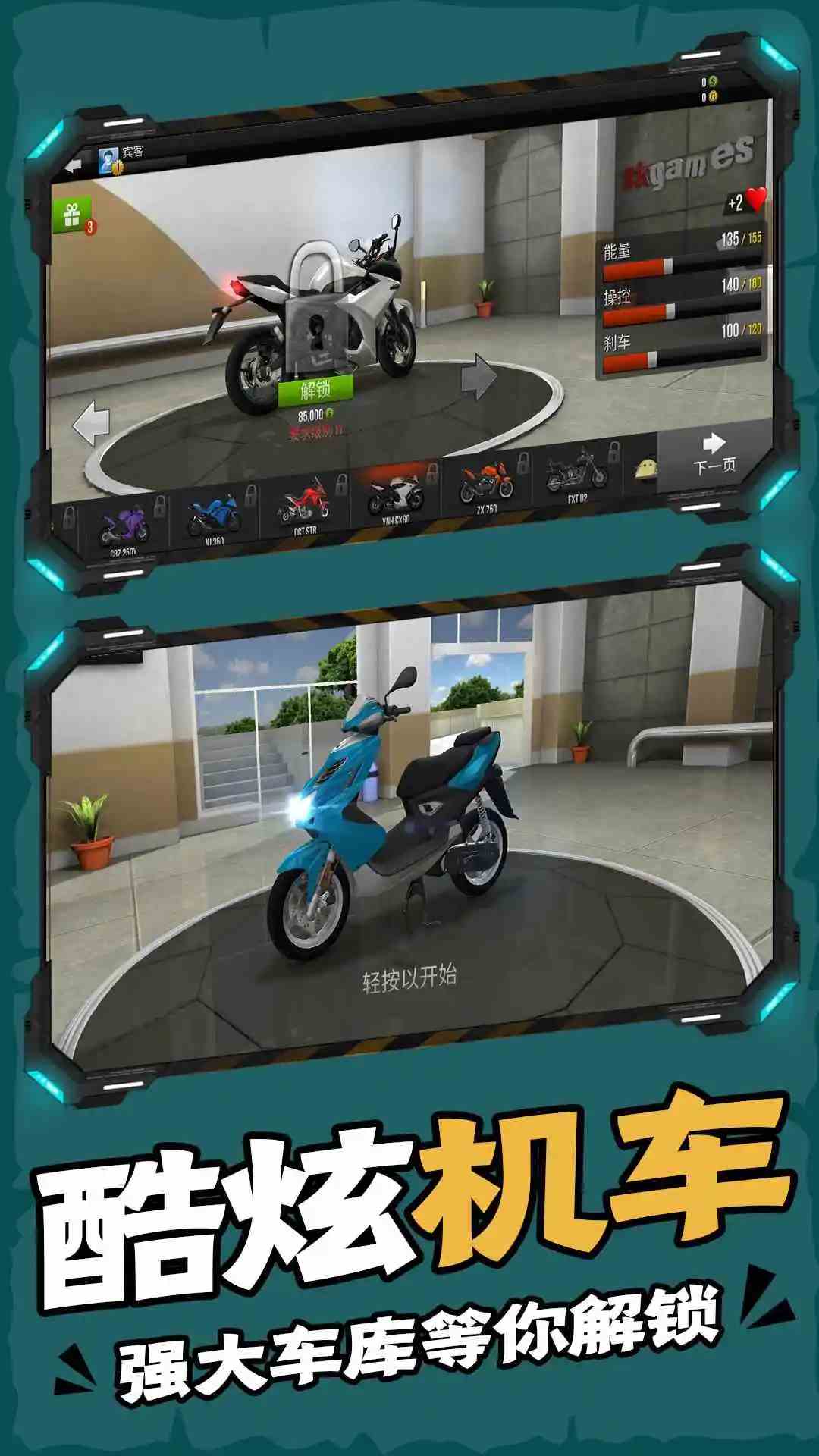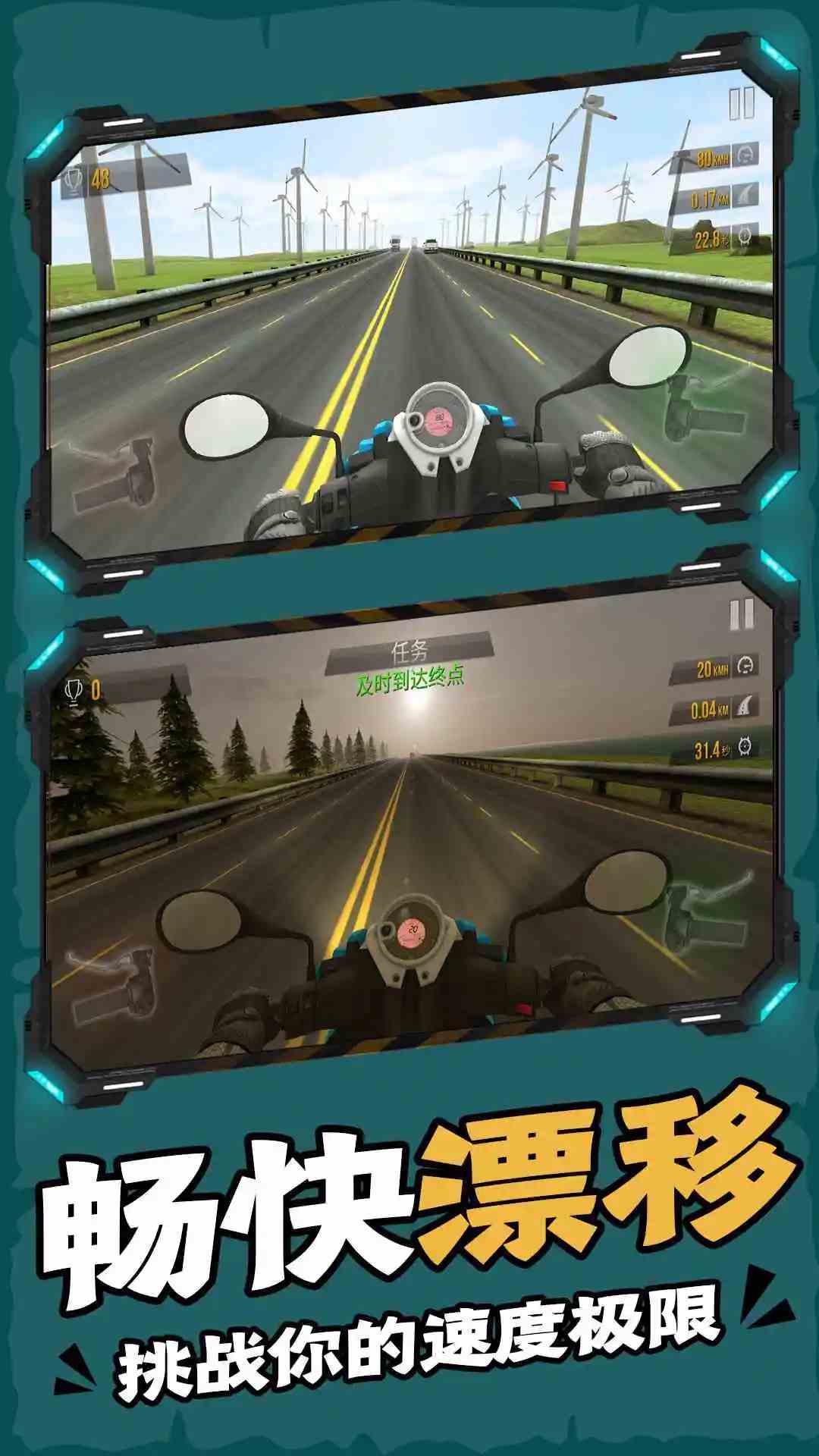 一款摩托车模拟游戏,玩家可以选择不同的摩托车进行驾驶。游戏中有多种游戏模式和难度等级,让玩家可以根据自己的喜好和实力进行选择。通过控制摩托车的加速、变向和刹车等操作,避开行驶车辆,达到终点。游戏的画面和音效非常逼真,能够让玩家感受到真实的赛车氛围,让人沉浸其中。同时,游戏中也有各种挑战和成就等待玩家去完成,增加了游戏的可玩性和挑战性。