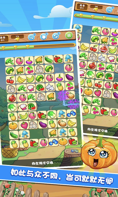 果蔬连连看3,在继承连连看游戏经典好玩的基础上,增加各种各样不同的移动模式,大大拓展了连连看游戏的精髓,重新定义了连连看游戏的制作方法,必将给您带来一个全新的改变世界观的沉迷,让您重新燃起对连连看游戏的热爱!