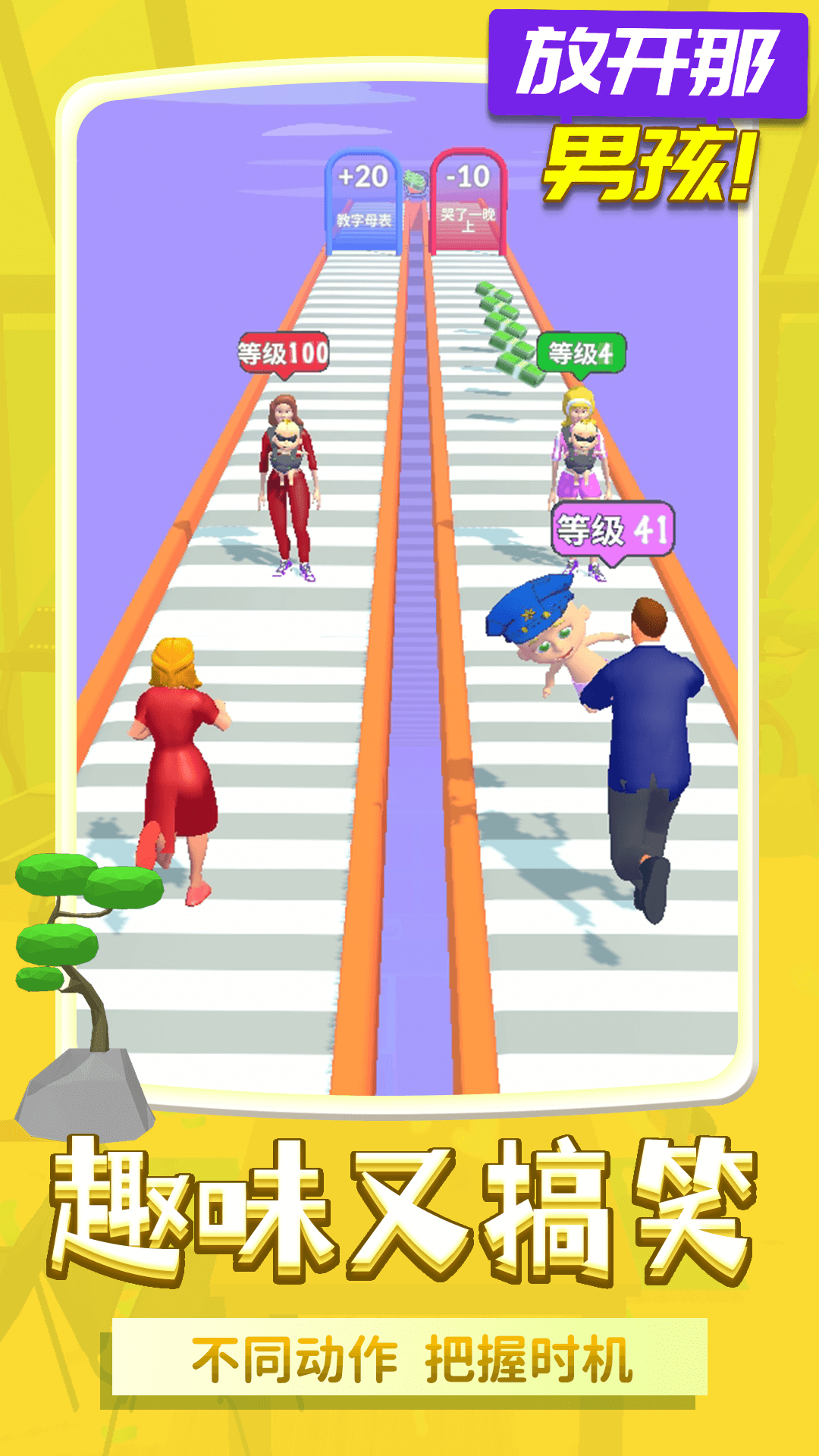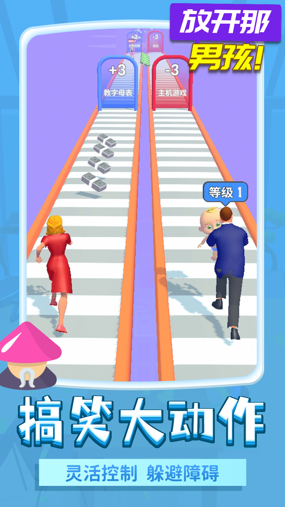 《放开那男孩》是一款超休闲跑酷玩法的小游戏。玩家在游戏中控制孩子的父母将襁褓中的婴儿互相交换,为婴儿创造更好的成长环境,还要为孩子将来的生活努力收集钞票。好的成长环境可以提升孩子在游戏中的等级,在将来获得更好的工作与职位,从而收获较高的收益。而丰厚的收益可以让成年后的孩子购买必备的家具,装饰出温馨居家的家庭。快来体验一下吧~