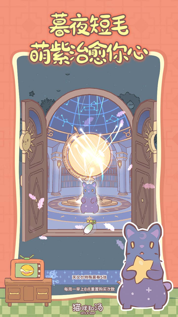 【新增活动】 1. 11月森林篝火派对-宾果活动(11月1日8点-12月1日8点); 2. 11月森林篝火派对-流浪工坊1期(11月1日8点-12月1日8点); 3. 开放万圣节限时扭蛋机(11月1日8点-12月1日8点),每日可抓取10次(包含免费3次,广告7次),扭蛋机奖励及次数每日上午8点重置; 4. 稀有和传说鱼几率提升(11月2日8点-11月4日8点),活动期间可购买<钓鱼次数补充礼包>: 【新增商品】 1. 开放11月通行证(11月1日8点-12月1日8点); 【新增资源】 1. 烹饪设施:榨柳橙汁; 2. 休憩设施:音乐盒; 3. 天文台上架普通猫咪:萨凡纳猫; 4. 天文台上架限定猫咪:万圣短毛猫(11月1日8点-12月1日8点),同时下架<彩虹短毛猫>。 【新增功能】 1. 新增套装一键装扮功能,已集齐的套装可一键装扮; 【其他优化】 1. 优化主题<银杏长城>的显示问题;