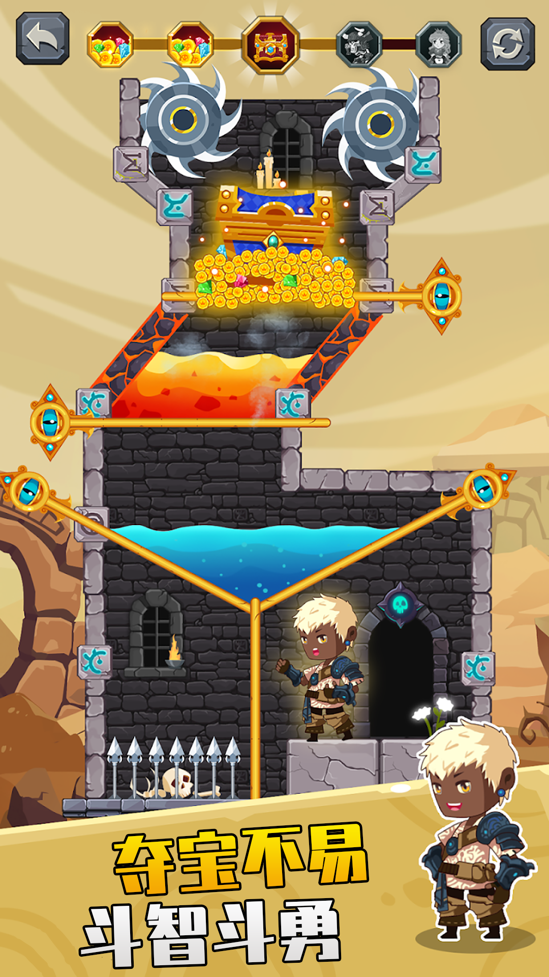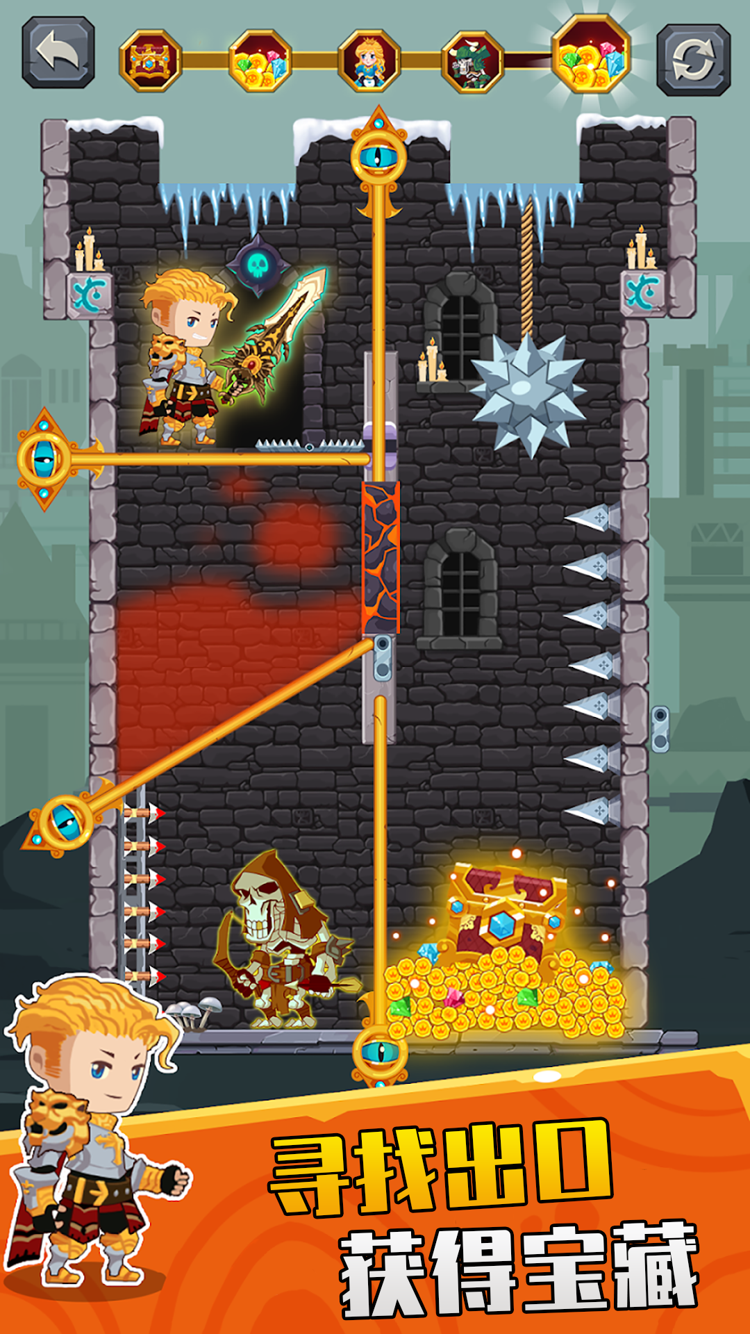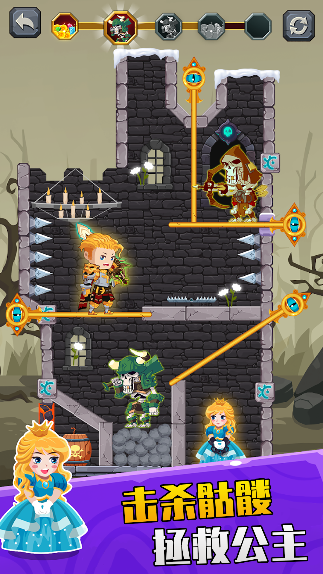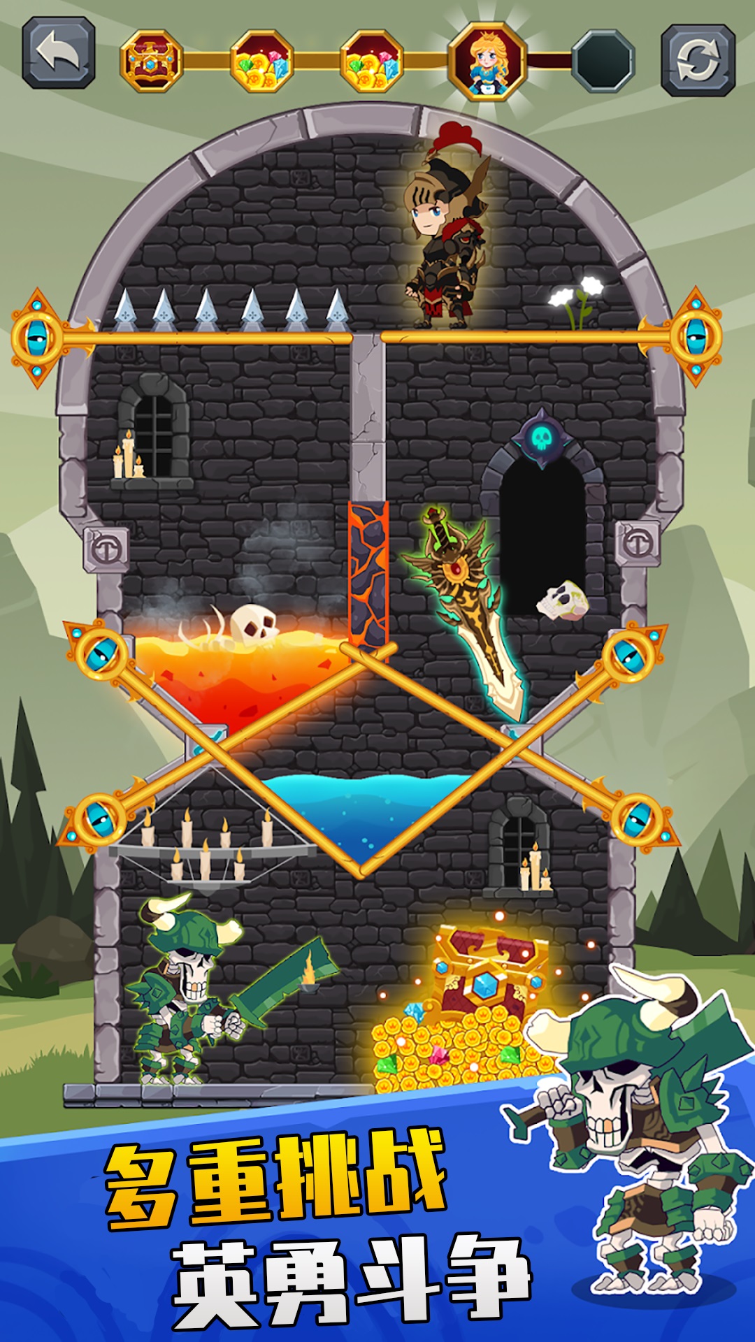 解决难题,拯救英雄。学习如何掠夺所有的宝藏,杀死怪物和拯救公主。拉针,以摧毁你的敌人拉熔岩和有毒气体到他们的拼图单位。剪断绳子,把公主从可怕的怪物中解救出来。