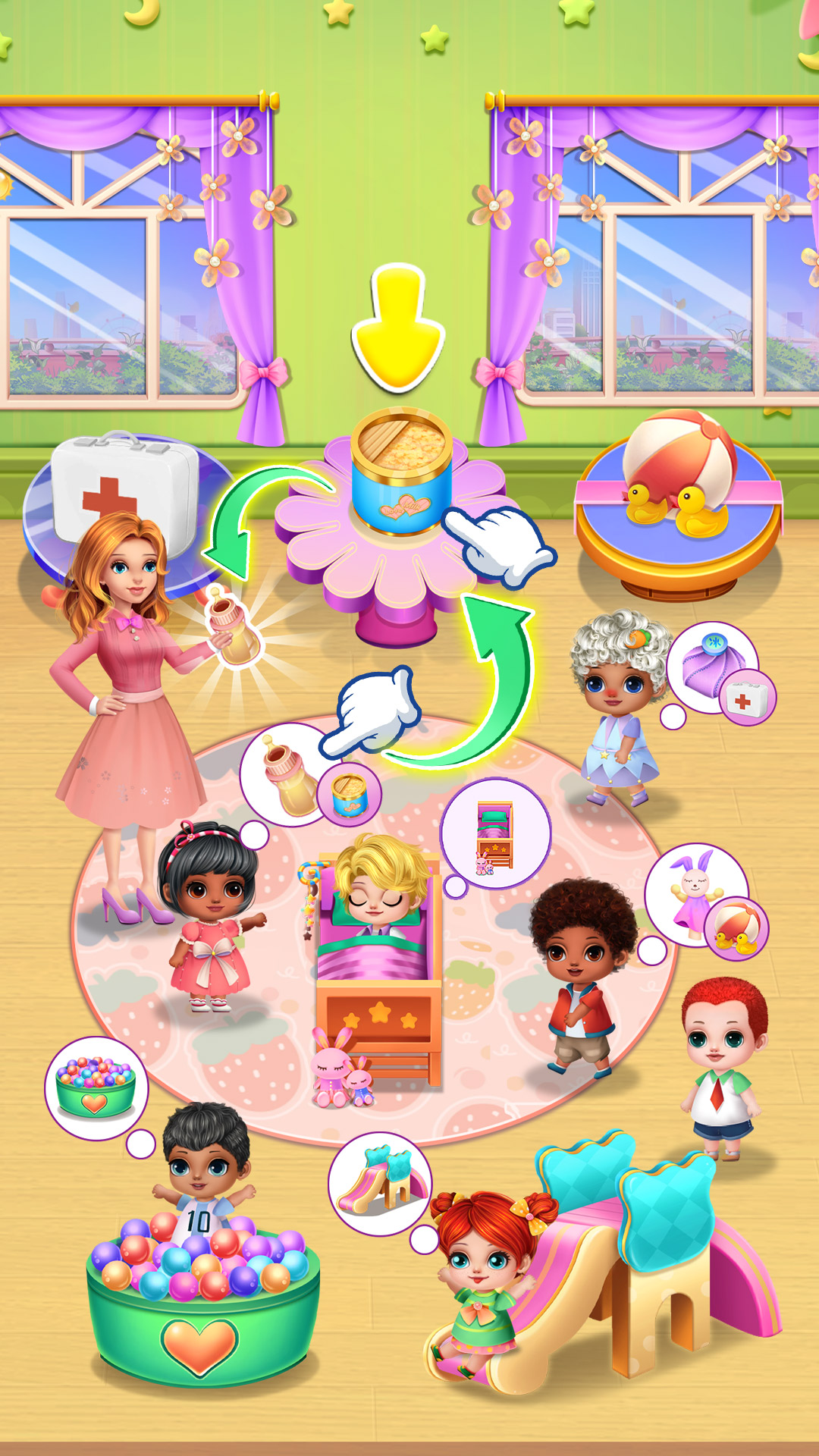 你将扮演幼儿园老师莉娜,照顾8个可爱活泼的小朋友,满足他们的各种需求,让他们健康快乐地成长。