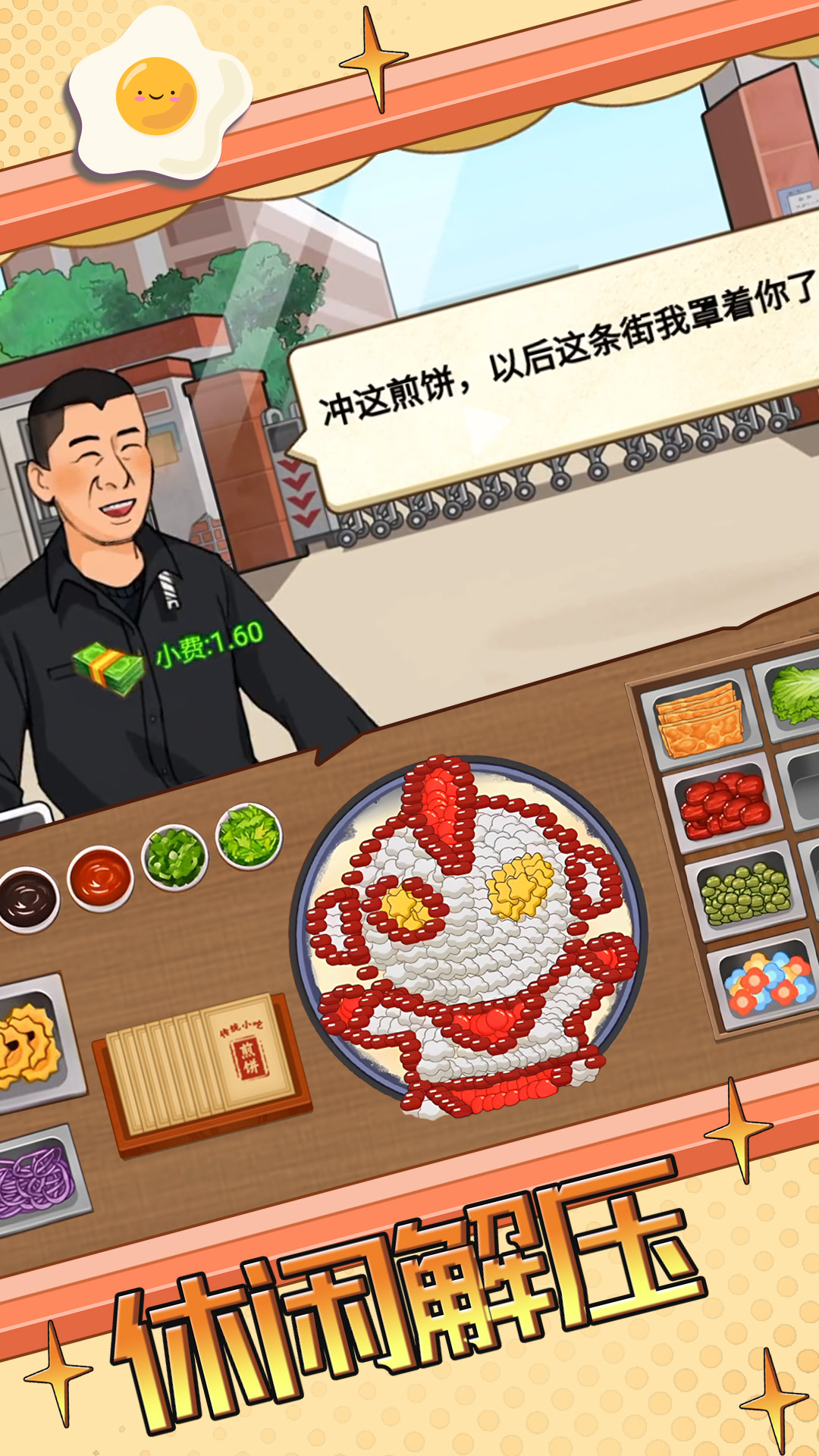 煎饼果子作为一款中国传统小吃,被誉为中国式披萨!你作为煎饼摊的摊主,游戏中将面临各种要求刁钻的客人,什么“煎饼果子不要煎饼”,“煎饼果子加一百个鸡蛋”等等,然后根据客人的需求做出让他们满意的可口煎饼!