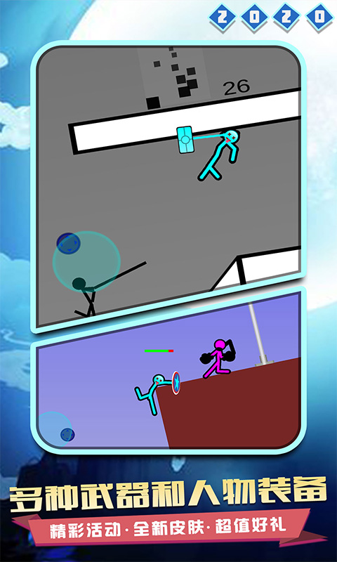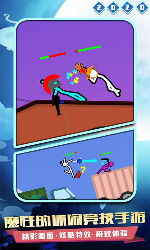 《火柴人对决2020》是一款休闲竞技类游戏,玩家进入游戏选择一个火柴人即可参与对战,只需要操控火柴人进行动作击败敌人即可。该游戏中玩家可以给自己的火柴人随意选择武器来进行对战,还有生动热血的音乐,需要做到的就是击败敌人。内设超多地图随机切换,玩家不仅可以靠自己的操作,还可以用策略以及地形的优势,请顺利的击败敌人,成功活下去吧!