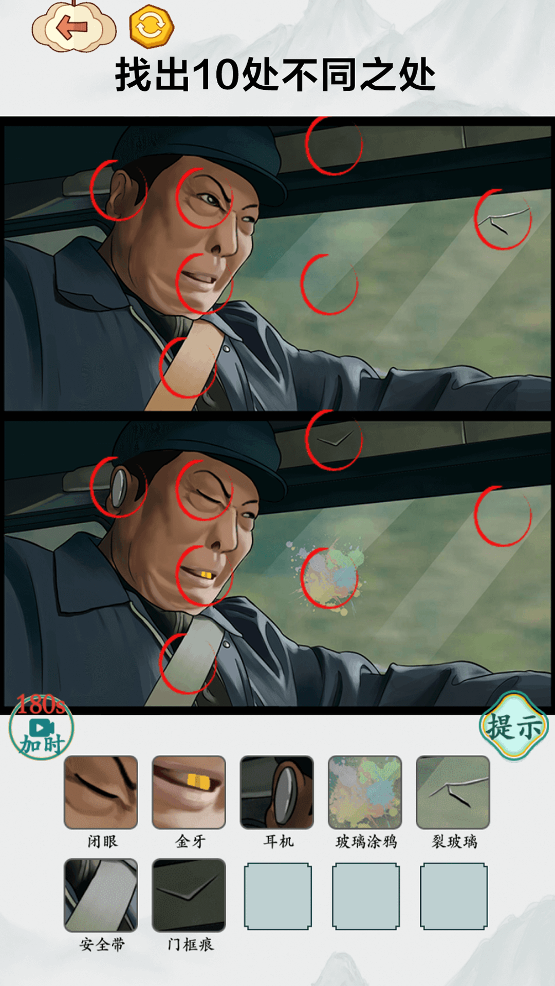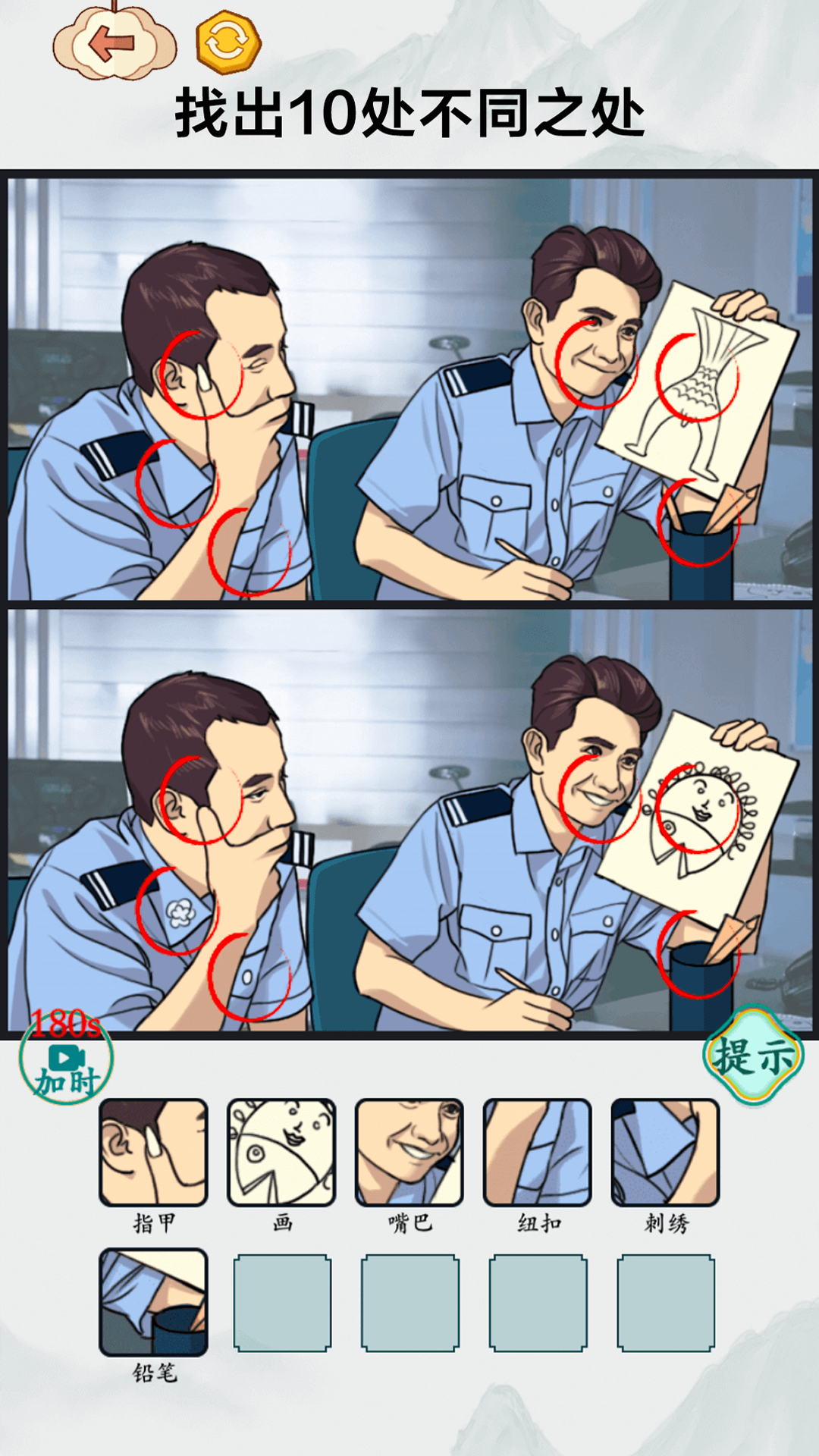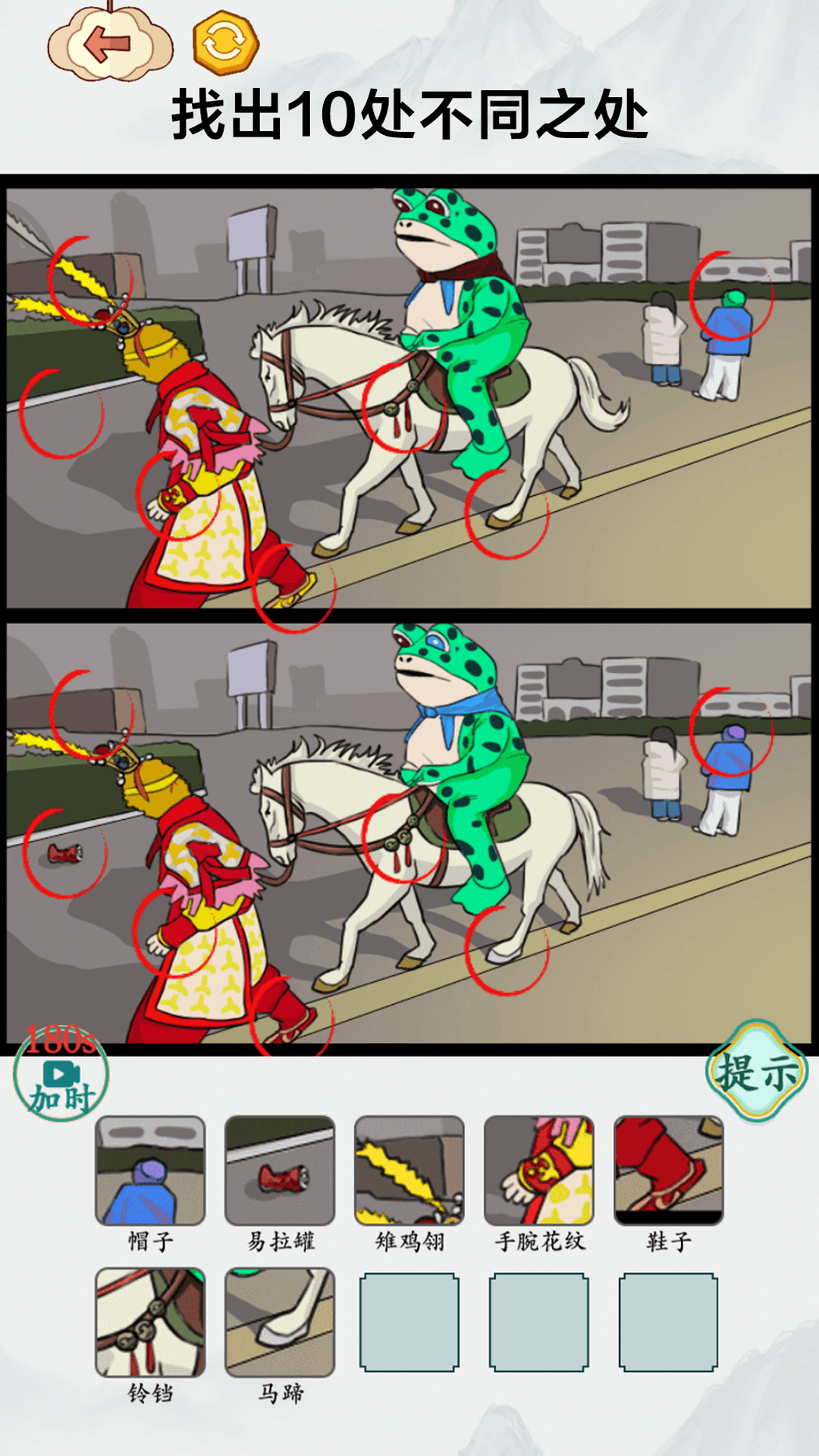 《找到10处不同》是一款休闲益智找茬游戏,玩家擦亮双眼开动脑筋,在一幅幅图画中找出不对劲的地方,比如存在于古代的电风扇、收音机、耳机等奇怪的物品。还有各种爆笑找茬图等你挑战,通过这款游戏能够提高您的观察力,专注力还有手眼协调能力,用来打发闲暇时光,看看谁的观察力最好!