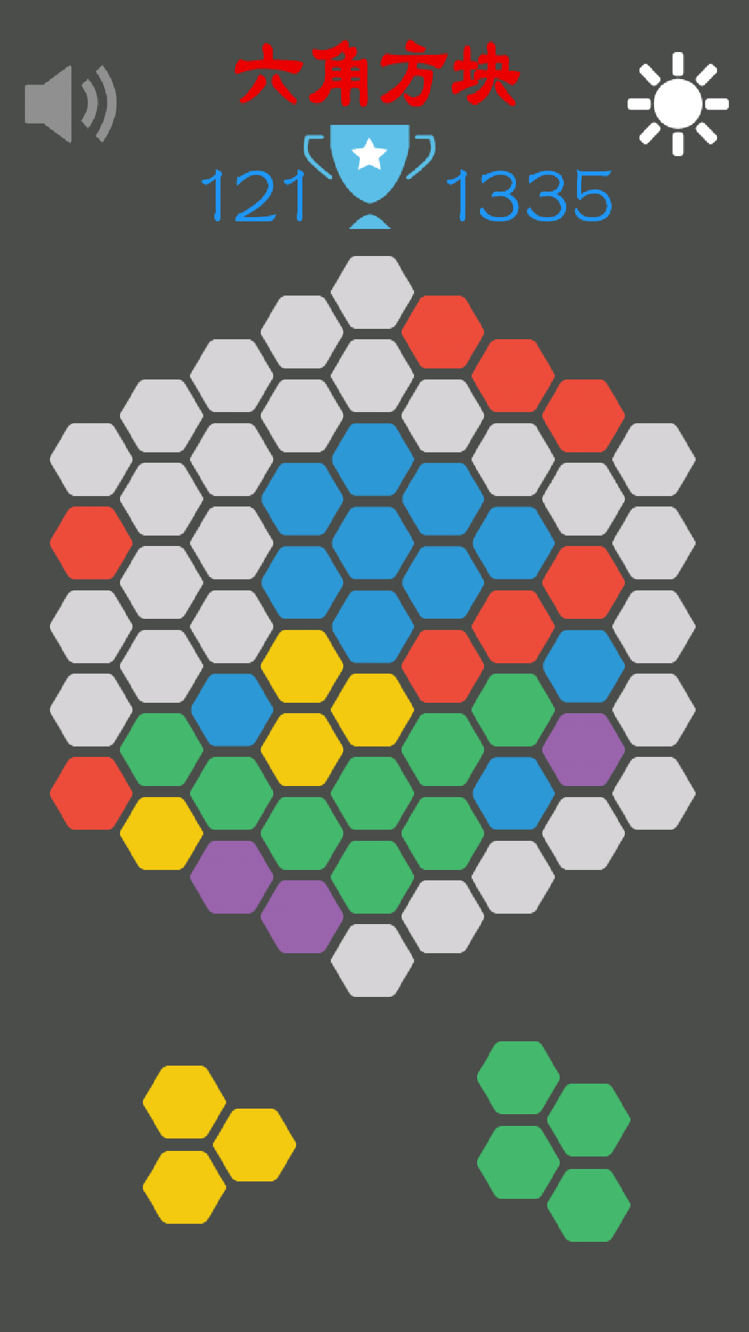 2.通过选择将六角方块将整行或整列或者斜列的方块进行消除,六角方块充满屏幕游戏即结束。