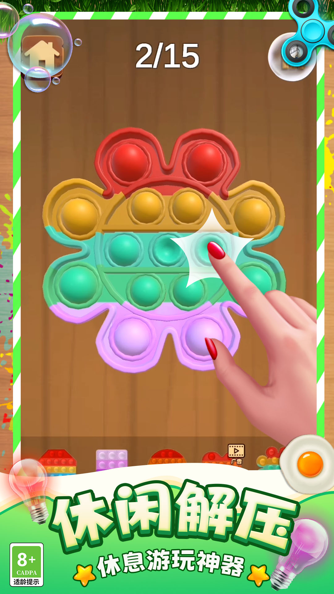 游戏中提供了38种不同类型的解压游戏,帮助玩家缓解自己的压力。游戏中的每一种玩具都经过现实中的热证,从捏泡泡、揉彩泥、演奏乐器,到敲打、碰撞等诸多玩法,异常丰富,让更多的玩家可以乐在其中。