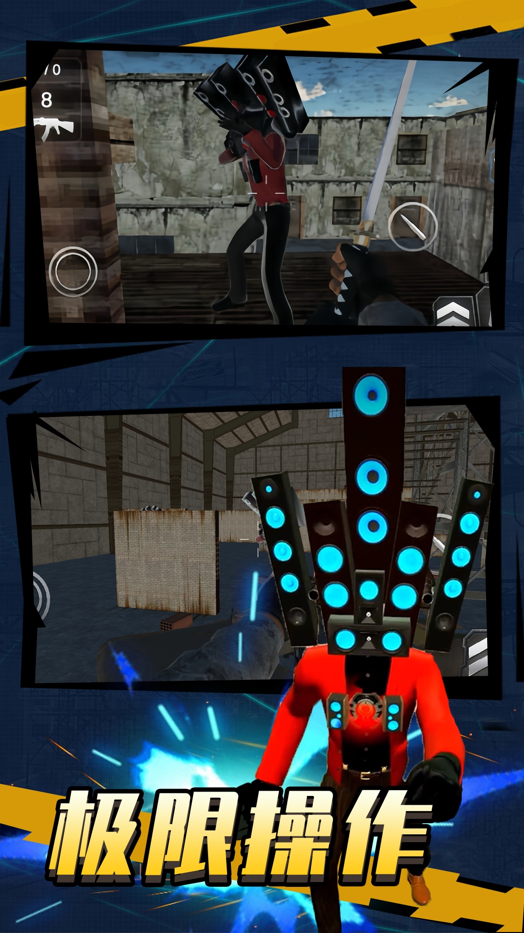 新版枪战音响人,经典的枪战玩法,全新的任务,带上你的武器加入战斗吧!工厂、监狱、瞭望台,废墟,港口,烂尾楼到处都有恐怖音响人的存在,变异的恐怖分子头插音响对你进行追杀,你需要利用手中武器躲避并击杀恐怖音响人,完成任务即可进入下一关,越往后难度越大,带着心爱的武器装备,试看谁才是这世界上不败神枪手!快来感受无与伦比的射击体验吧!