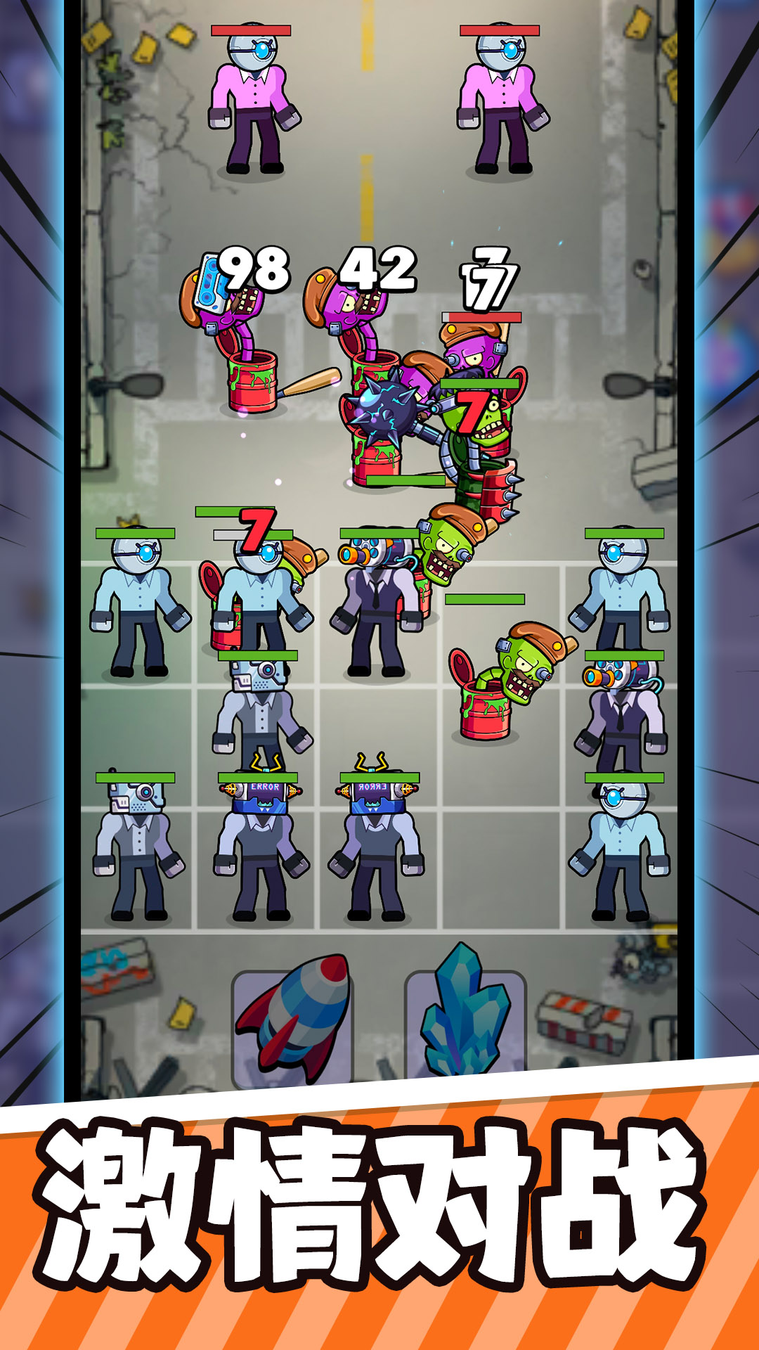 僵尸怪物是近战单位,将冲锋陷阵并近距离攻击敌人。它们坚固耐用,但速度缓慢,容易受到远程攻击。另一方面,网络人机器人是远程单位,可以从远处攻击敌人。它们快速敏捷,但不如僵尸强大或耐用。