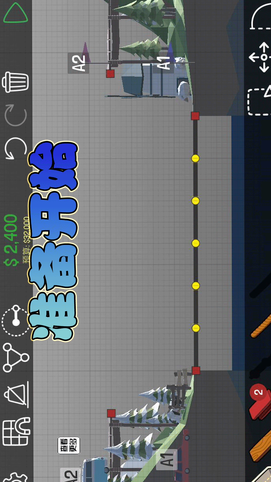 玩法:首先要有一条路面,在使用绳子或绳子等各种工具,固定桥梁,使他不要坍塌。在教程中可以学习到很多种搭桥的方法,能顾帮助你在后续的关卡中。