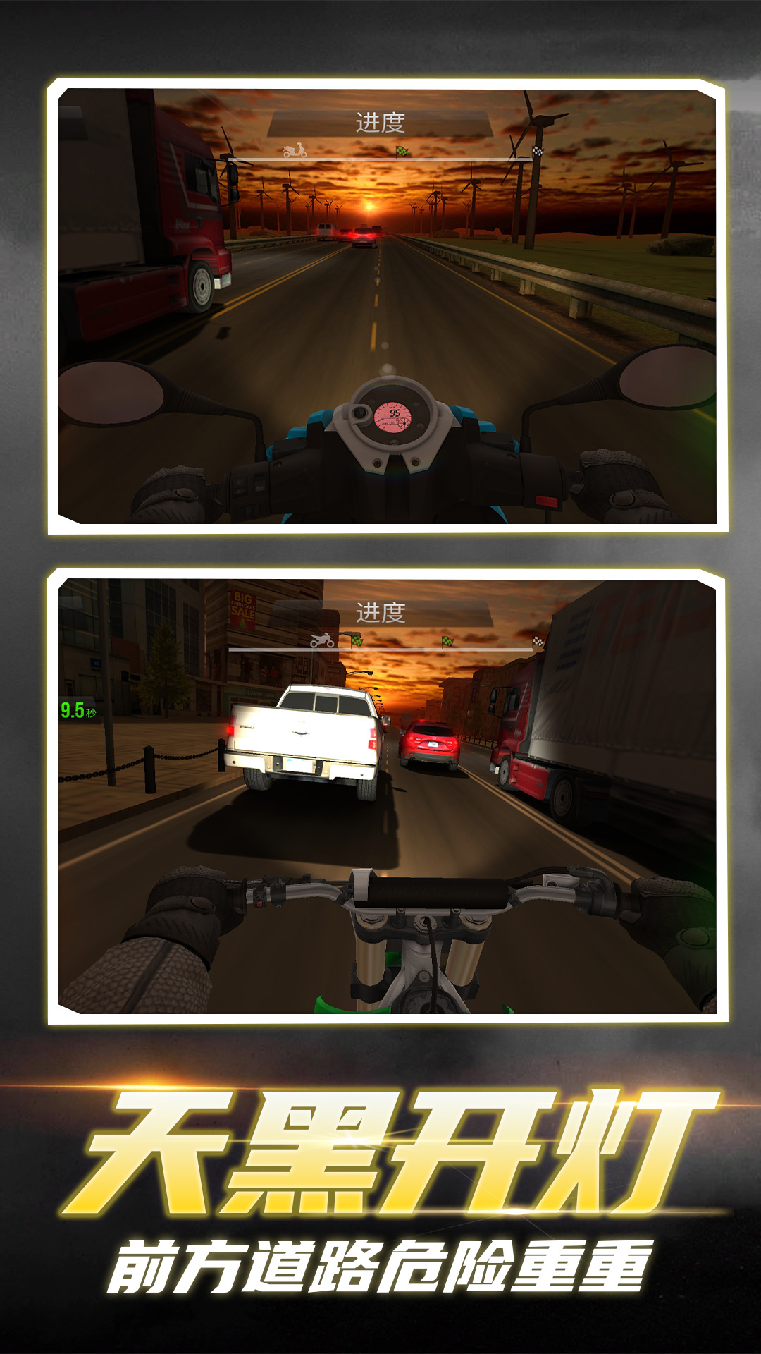 《都市摩托英雄》是一款主角视角的公路摩托车竞速游戏,通过加入完整的职业模式、车手视角、更佳的地形以及在现实生活中记录的摩托车声音来将无尽赛车游戏类型提升到全新的水平。 平滑街道赛车的精髓依然存在,驾驶摩托车在无尽头的公路上超车,升级并购买新的摩托车,在职业模式中完美完成任务。