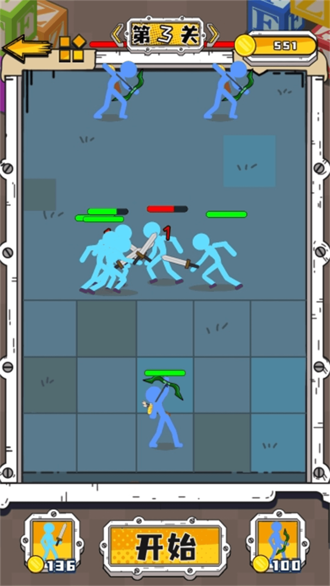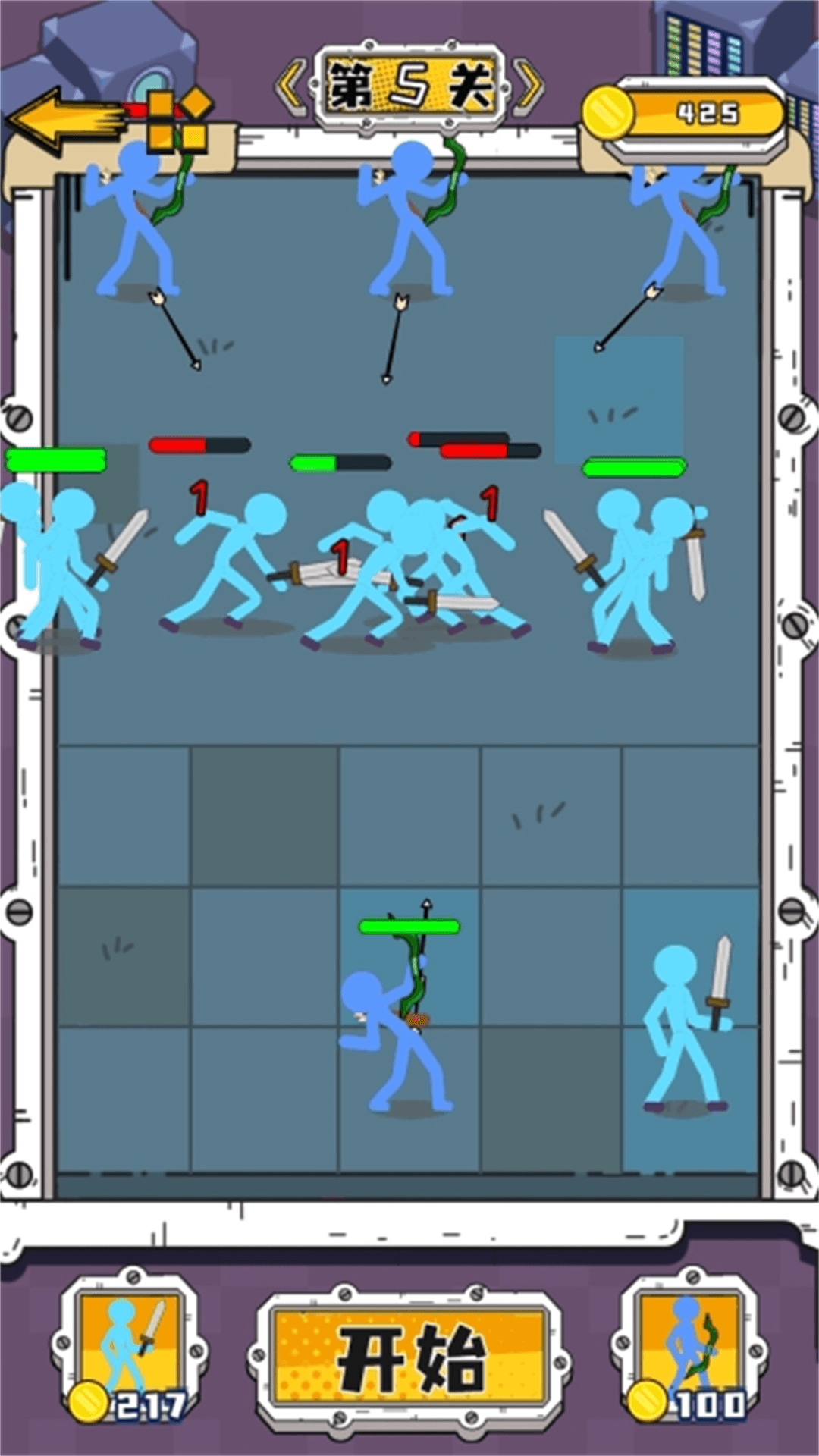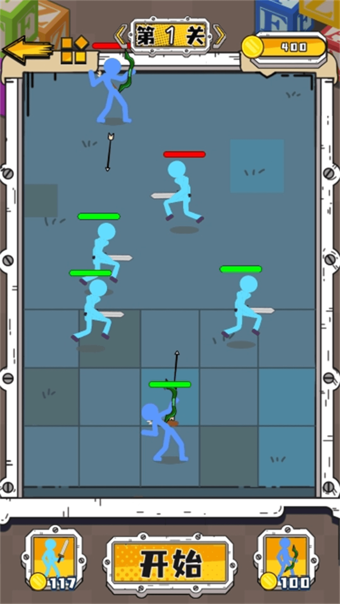 《火柴人军团大作战2》该游戏是一款休闲策略小游戏,该游戏需要玩家招募自己的部队,在房间内摆放部队多种阵列进行进攻,点击开始战斗后你的部队将和敌人对战在一起,击败所有的敌人获得胜利。该游戏还有趣味的音乐,海量的小英雄角色,快来一起试试吧!