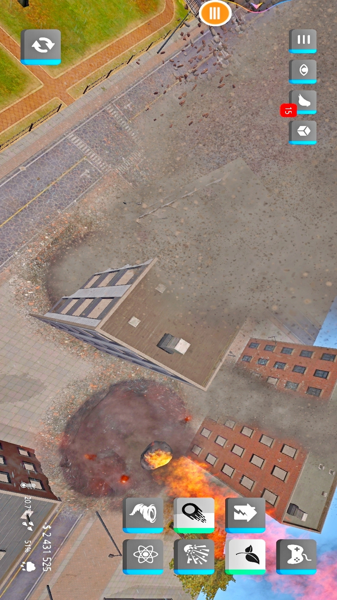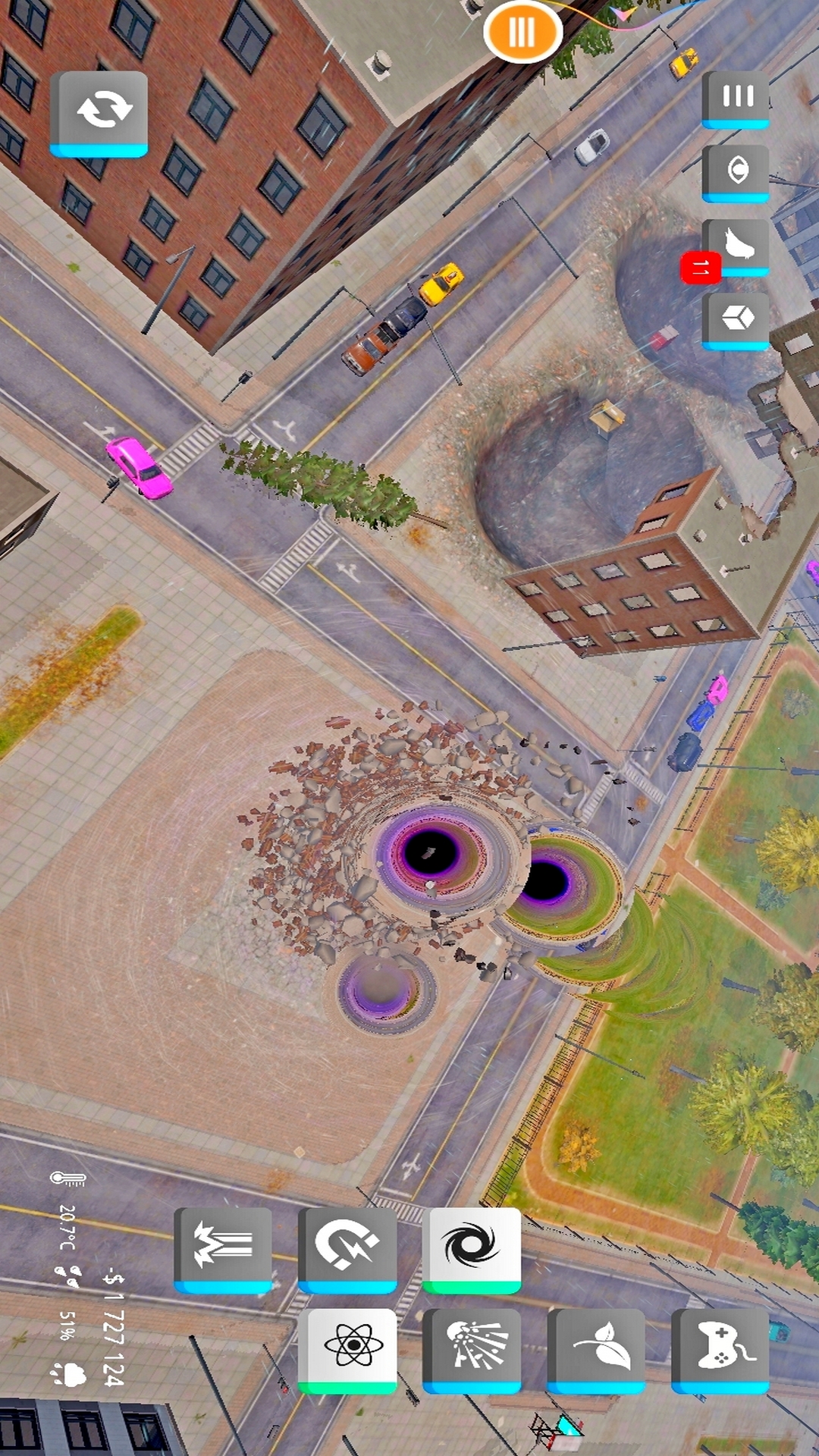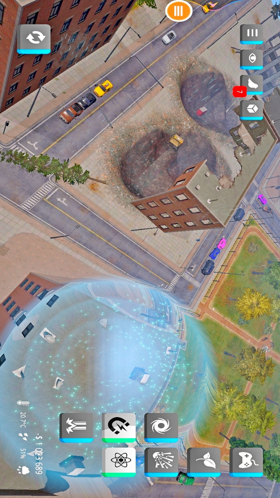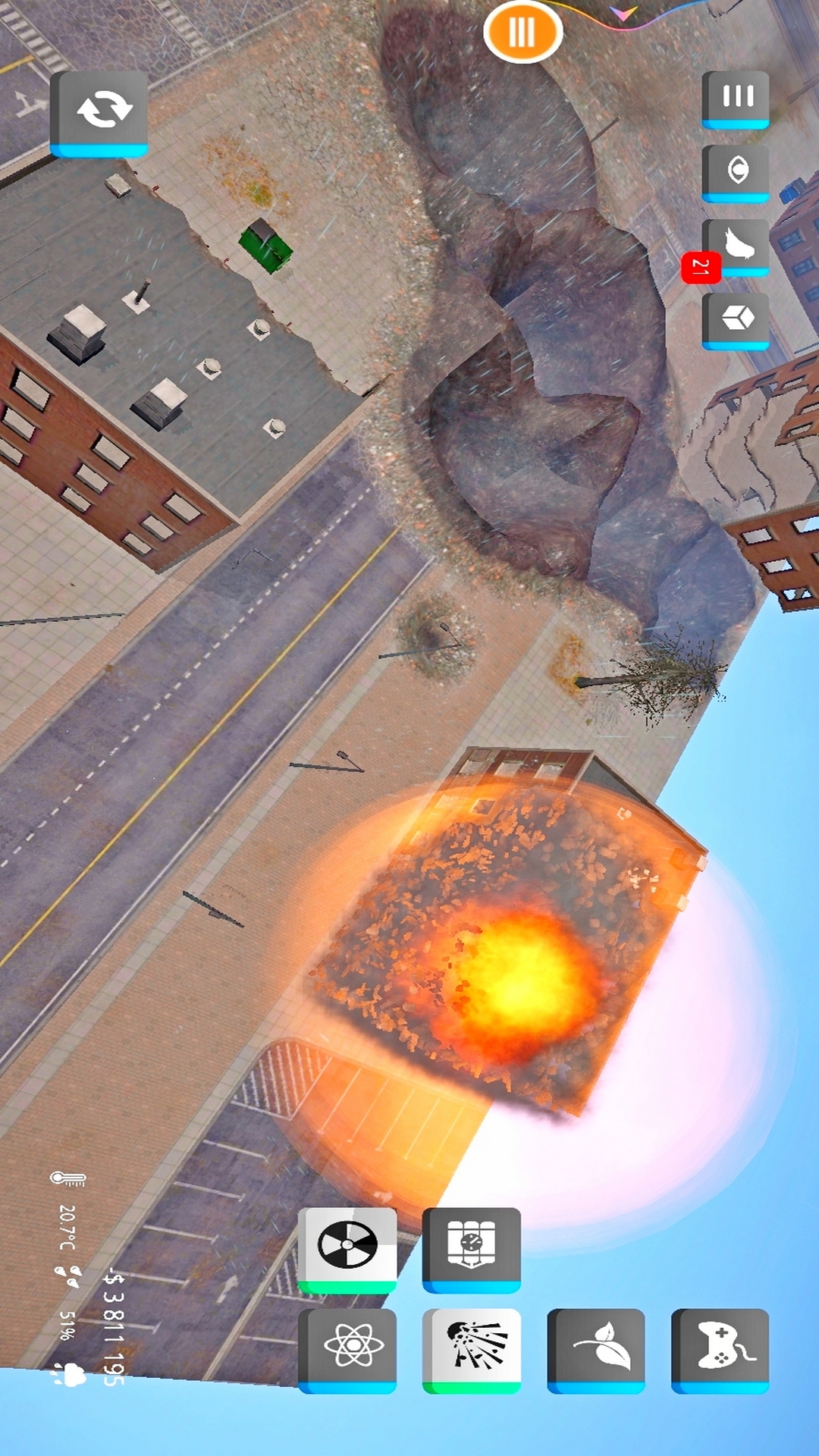 是一款玩起来超解压的休息类手机游戏,在这款游戏中玩家可以使用各种不同的武器对城市进行破坏,你甚至可以召唤陨石亦或者释放一个黑洞,玩起来非常的有趣。