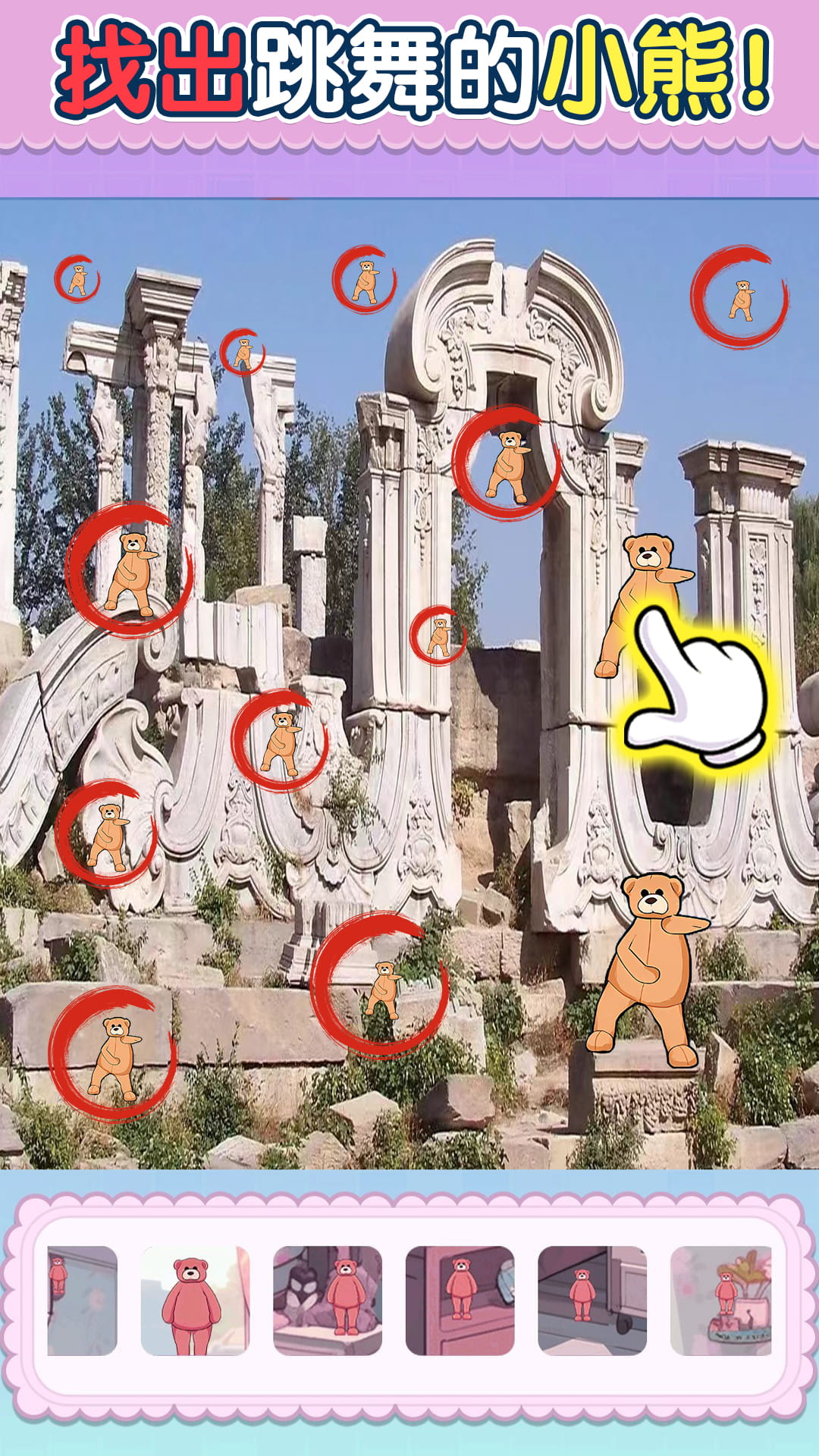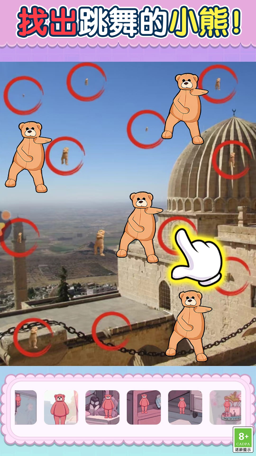 在这个缤纷多彩的场景中,隐藏着许多正在欢快跳舞的小熊。您的任务就是擦亮双眼,集中注意力,从复杂的场景中找出所有跳舞的小熊。