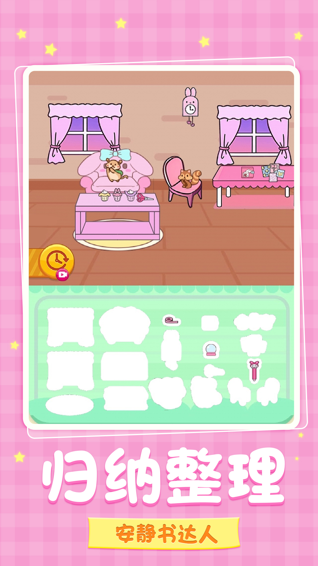 安静书萝卜刀整理是一款通过在场景中把物品摆放好的游戏,依照生活常识,把东西整理好,装扮小屋的各个场景,快来感受一下吧!