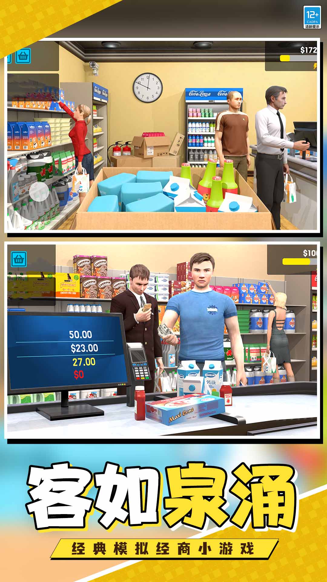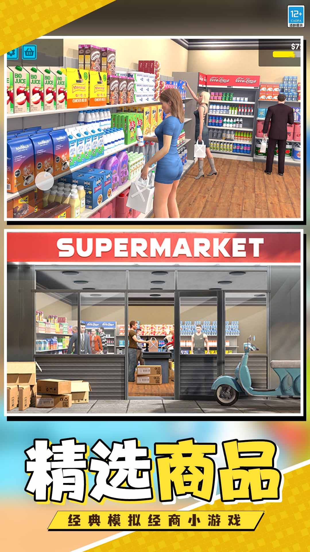 开个超市当老板是一款模拟经营游戏,在游戏中,你将获得一个全新的超市店面,在这里你将跟随引导,学习如何在超市内自由行动,整个超市都由你来掌控,调整超市布局,为超市增添货架;学习商品知识,进货补货,填充超市售卖品,商品内容越丰富,就会吸引更多的客人前来消费!随着收益增多,你可以对超市进行升级,扩充超市区域,让整间超市布局更加合理化;同时还可以购买商品售卖许可证,让超市商品的品类更加丰富!除了学习超市经营之道,在游戏内你还需要强大的计算能力,快速为客人进行结账找零,记住不要让客人久等了!