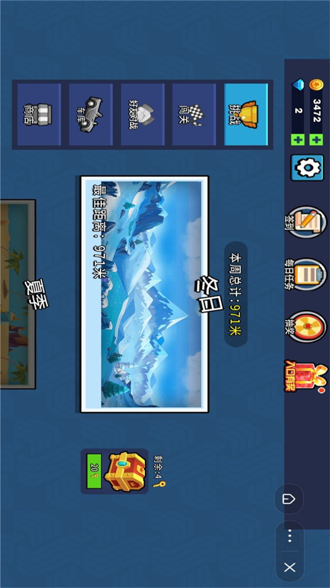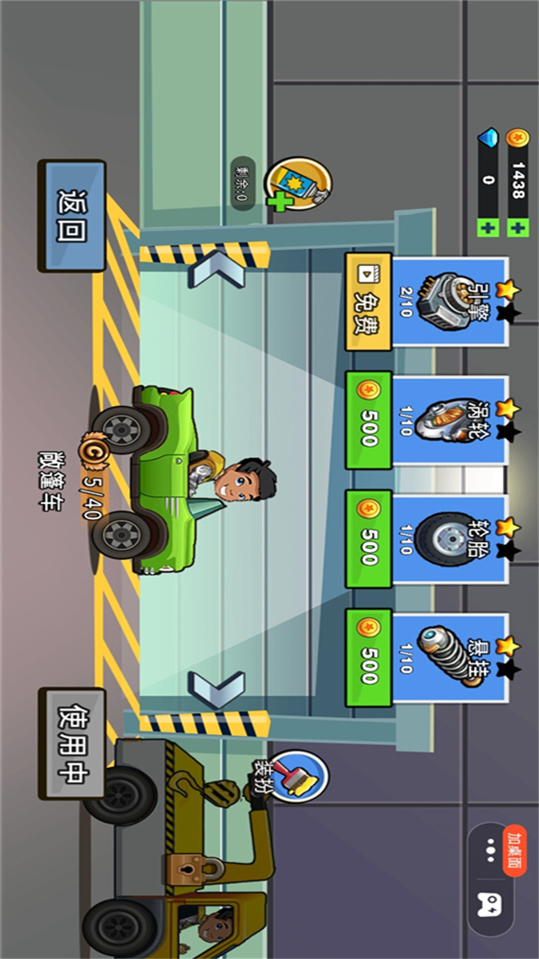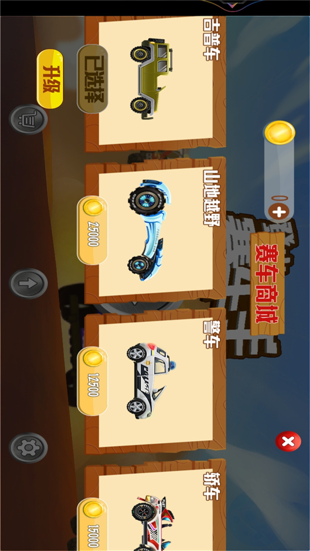 操作飞车的方法也很简单,通过控制手机的屏幕上左右两边按钮来控制登山车的开车速度和方向,避免翻车,可以通过拾取路上的金币添加金钱数量可以在商店中替换东西。