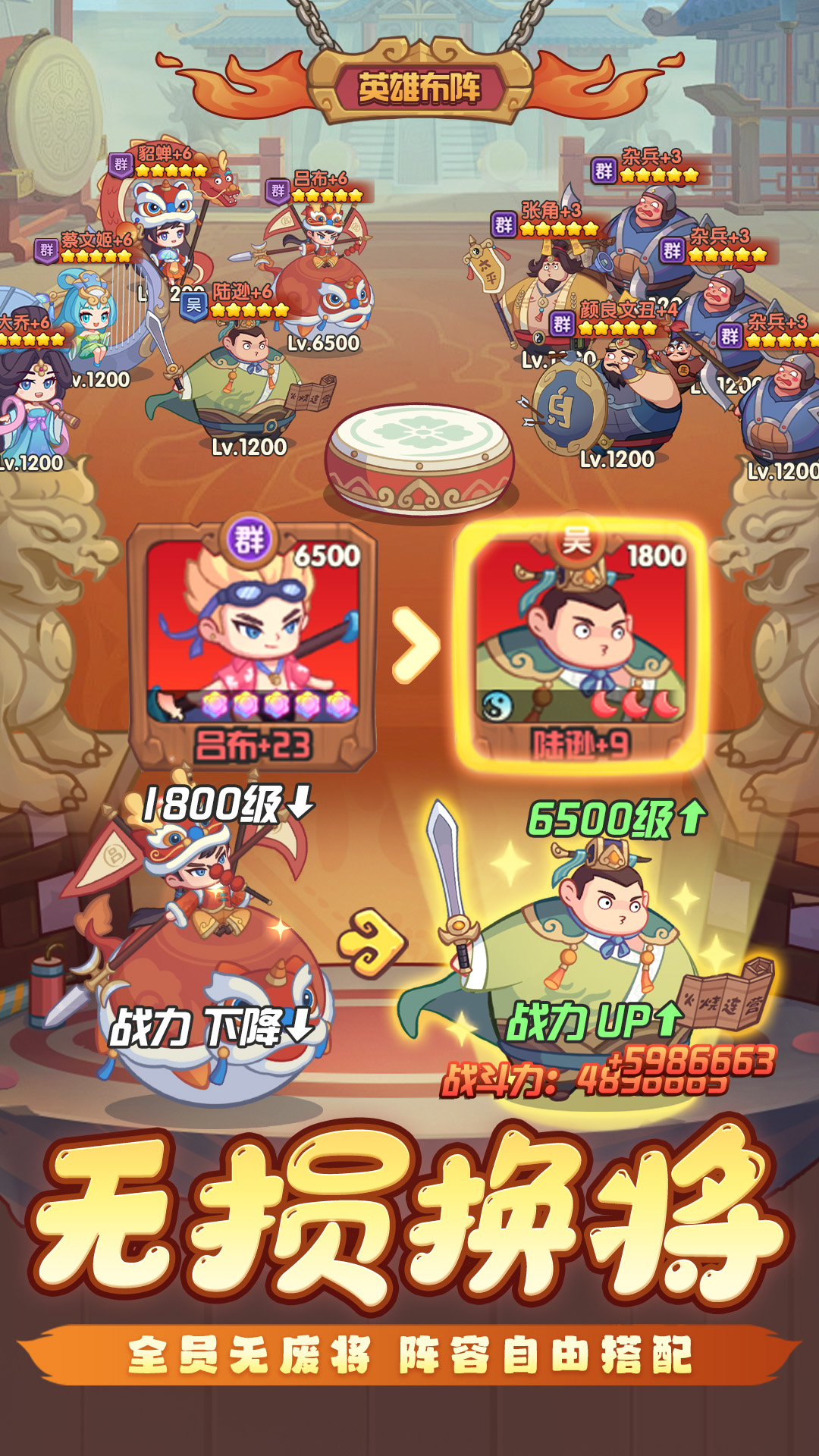 通过离线挂机就能获得不同品阶的宝箱,获取资源和英雄,游戏上线送1000连抽,助力前期起号;游戏里通过开箱可得吕布关羽等英雄,首充6元即送红将吕布,是当前版本万金油的主c选择,前期元宝、进阶石等资源都喂给他,一天直推1000关!