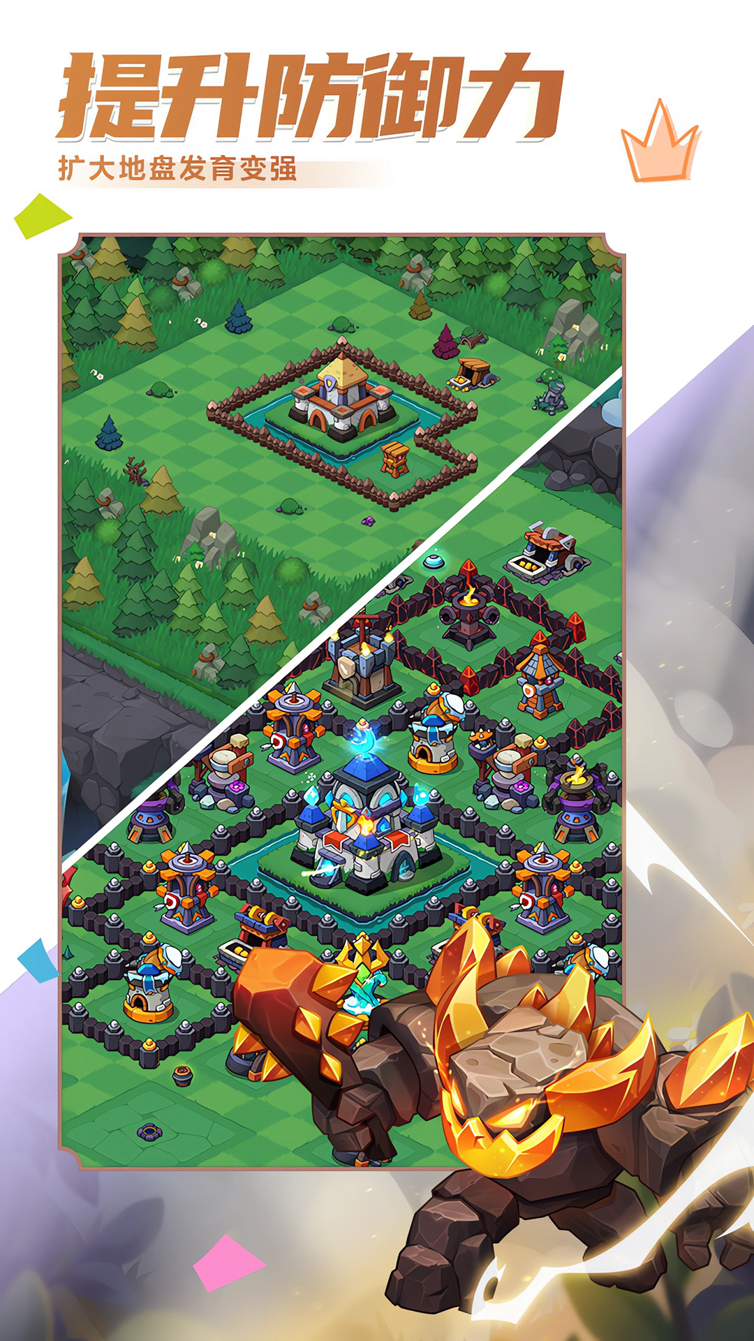 欸…有人偷家?快!升级基地塔防御,扩大伤害范围!想要更多资源?直接战斗吧!发挥超神策略,组合远程/近战/射手不同兵种释放技能,操控瞬息万变战局,坐等对面嘤嘤嘤跪地求饶!