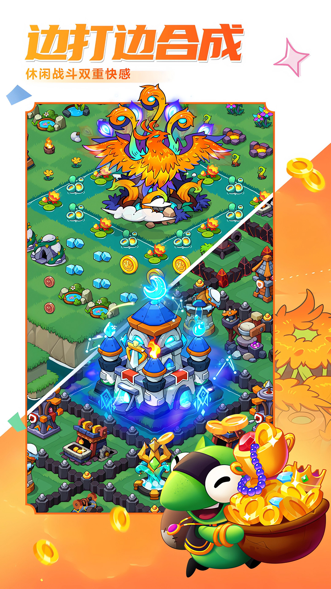 拖动相同物品合成,一秒即可进化;合成豆豆获得伙伴之力,可开垦更多土地;合成高产遗迹享受在线报恩,点击就有一波奖励尽情收割!