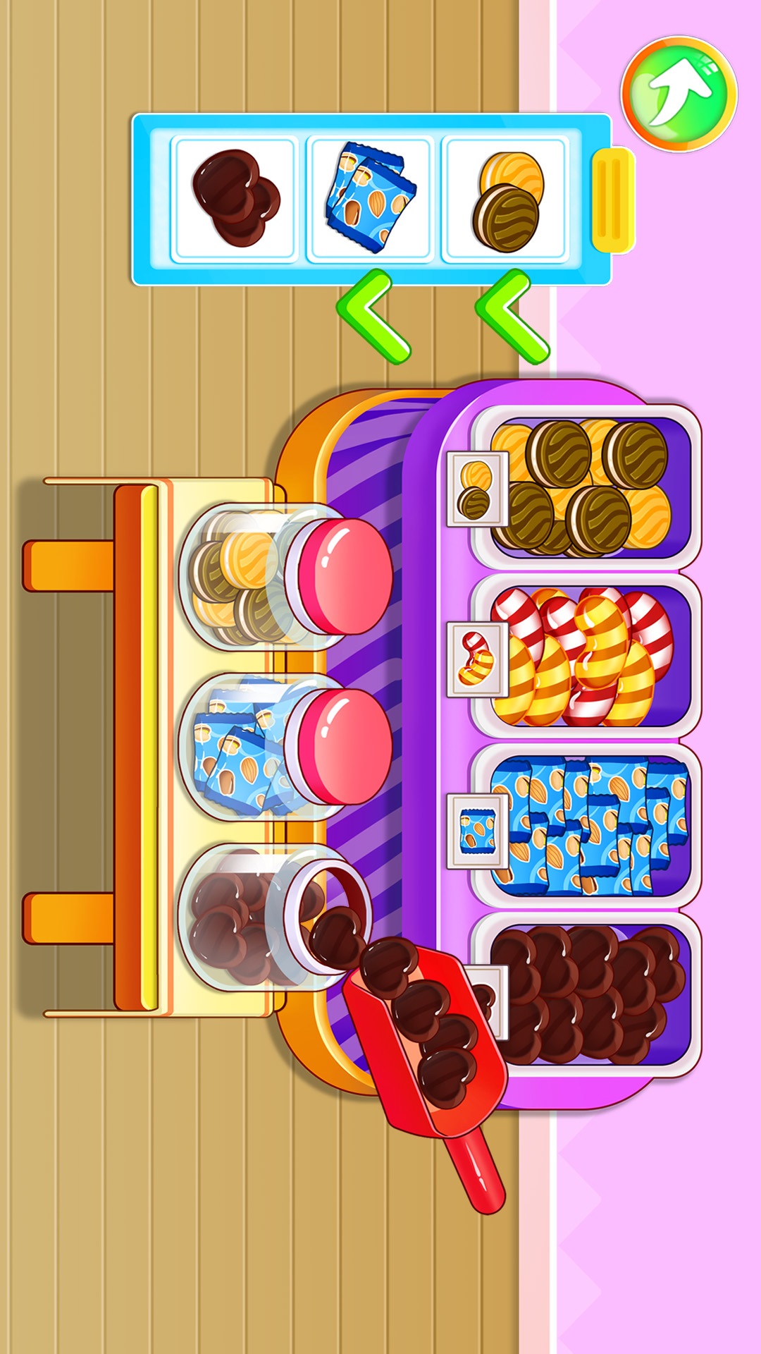 真实还原线下超市,设置十几个个商品柜台:食品区、生鲜区、服装区、玩具区......各种商品应有尽有。巧克力,坚果,饼干被放在同一个货架上,它们都是零食类,宝宝们记住了吗?