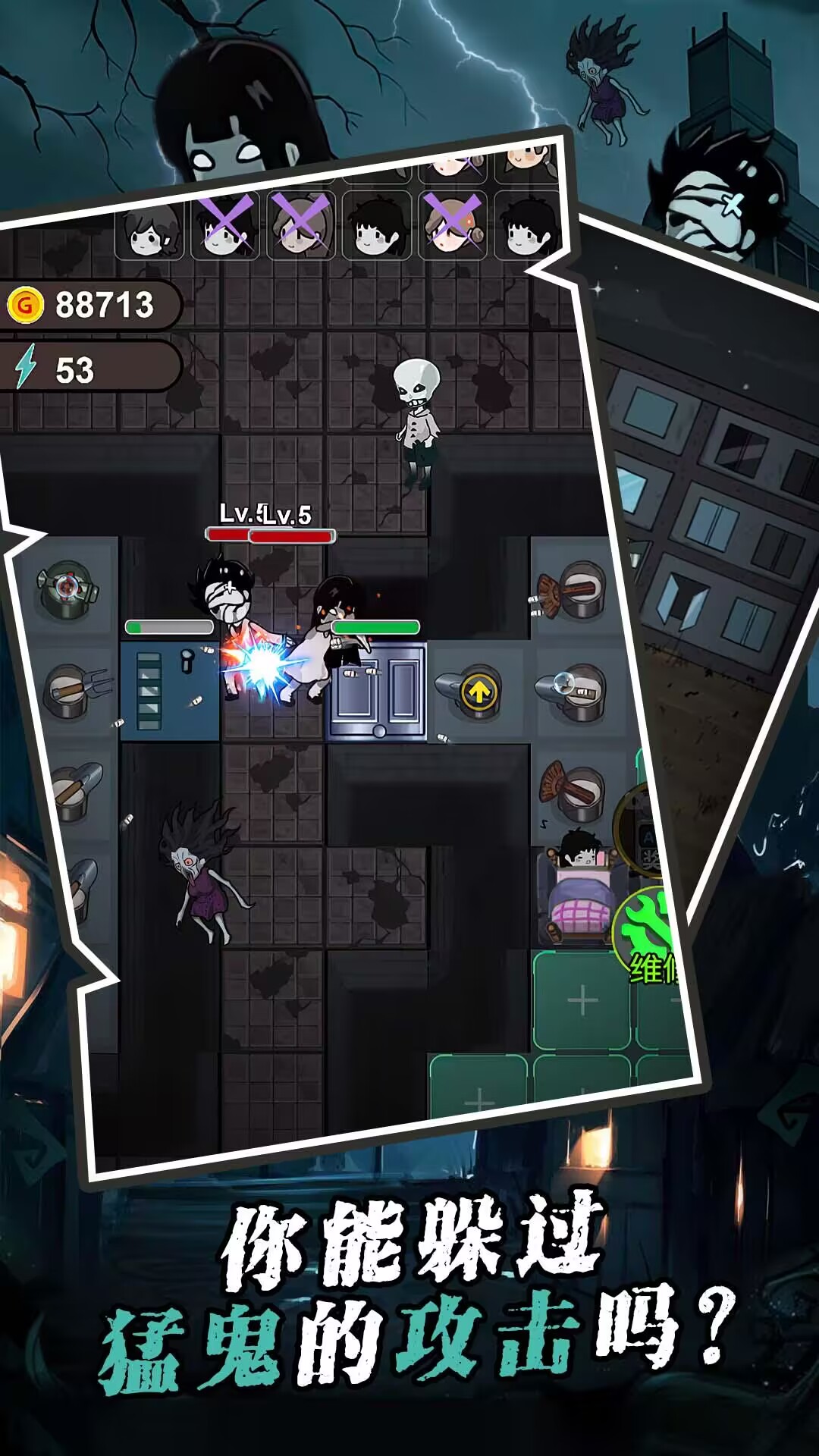 一款2D塔防小游戏。游戏中玩家需躲避猛鬼的追捕,寻找适合自己的宿舍躲避,并发展经济建造炮台,抵御猛鬼。游戏中玩家只可以在房间中的空地板上进行建造,玩家点击空地板后,出现建筑菜单。游戏中玩家需要根据自己当前的经济选择性建造建筑,发现一条符合自己发展的道路。玩家需要将鬼击败或者抵御至天亮方可获胜,反之鬼抓到玩家则玩家失败。