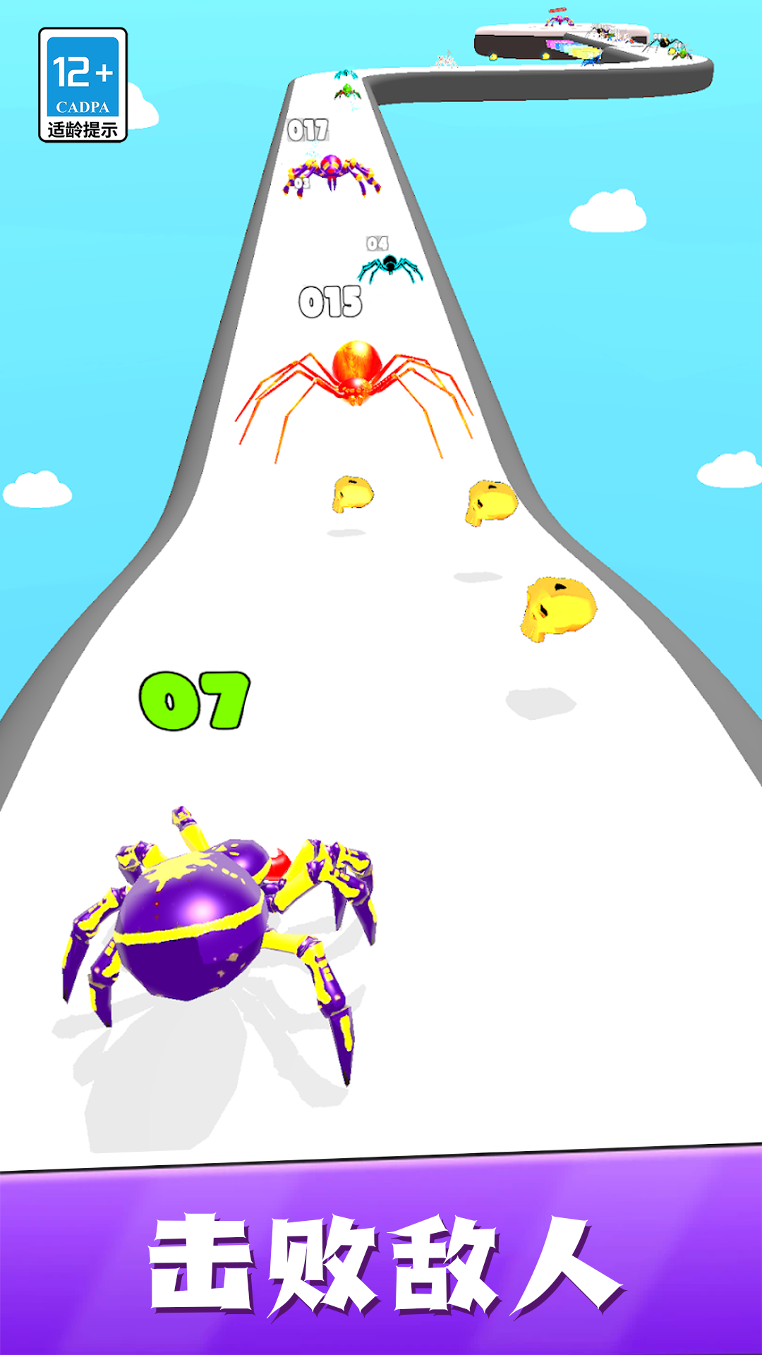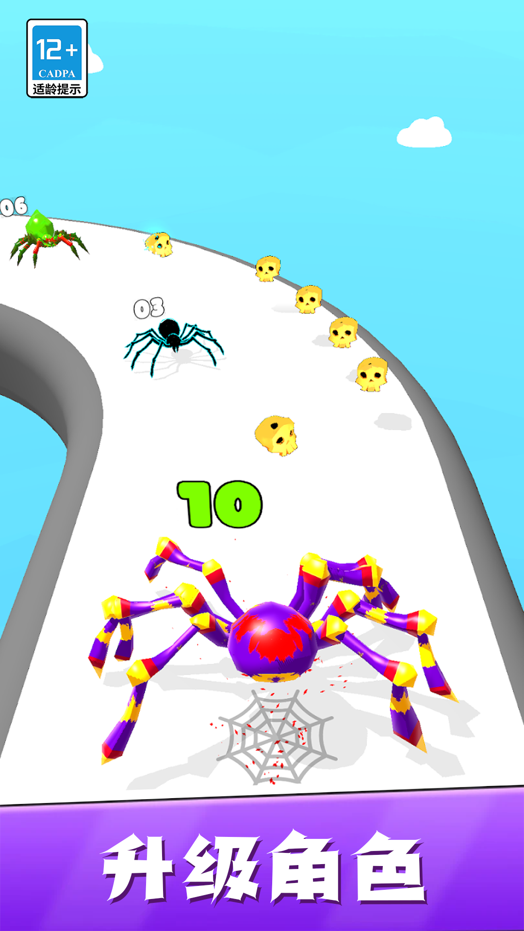 《酷跑大挑战》是一款以蜘蛛形态为角色的休闲游戏,玩家需要控制蜘蛛在游戏中不断奔跑,躲避各种障碍物,并通过接触同等级或低等级的蜘蛛来合成更加强大的蜘蛛。 在游戏中,玩家将面临各种挑战和障碍,需要灵活应对和适时躲避,同时还要通过不断合成进化蜘蛛,让自己的角色变得更加强大,以便快速扫荡一切阻碍。通过不断挑战和提升,玩家可以突破自我,刷新游戏记录,体验到游戏的成就感和乐趣。 游戏画面精致、色彩鲜艳,音乐节奏明快,游戏节奏紧凑刺激,让玩家沉浸在游戏的世界中,享受挑战和冒险的乐趣。同时, 总的来说,《酷跑大挑战》是一款富有创意和挑战性的休闲游戏,适合喜欢挑战和冒险的玩家。如果你喜欢不断挑战自我,探索各种游戏机制和合成系统,那么这款游戏将会给你带来很多乐趣和挑战。快来体验一下这款有趣的蜘蛛奔跑游戏吧!