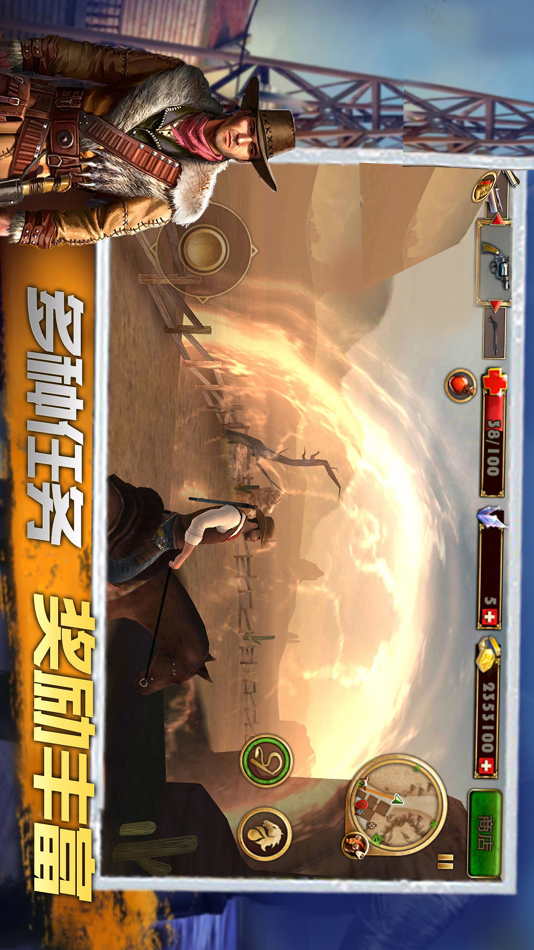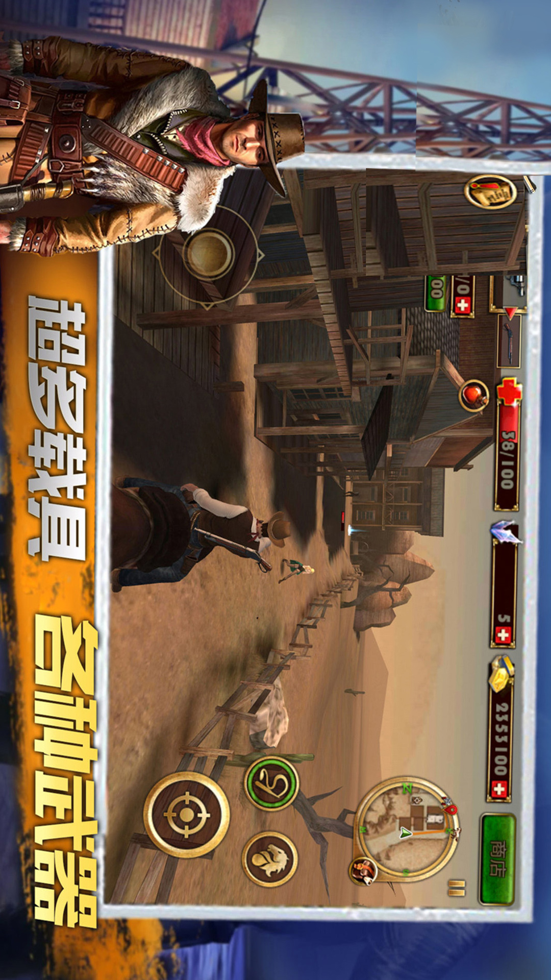 本游戏含有多款稀有装备、多个品种骏马、先进枪支武器、个性皮肤任玩家选择。例如:昂贵的边疆左轮手枪;精准的半自动猎枪;威力极大的防爆散弹枪等等。你想成为西部世界中的牛仔吗?快来体验吧