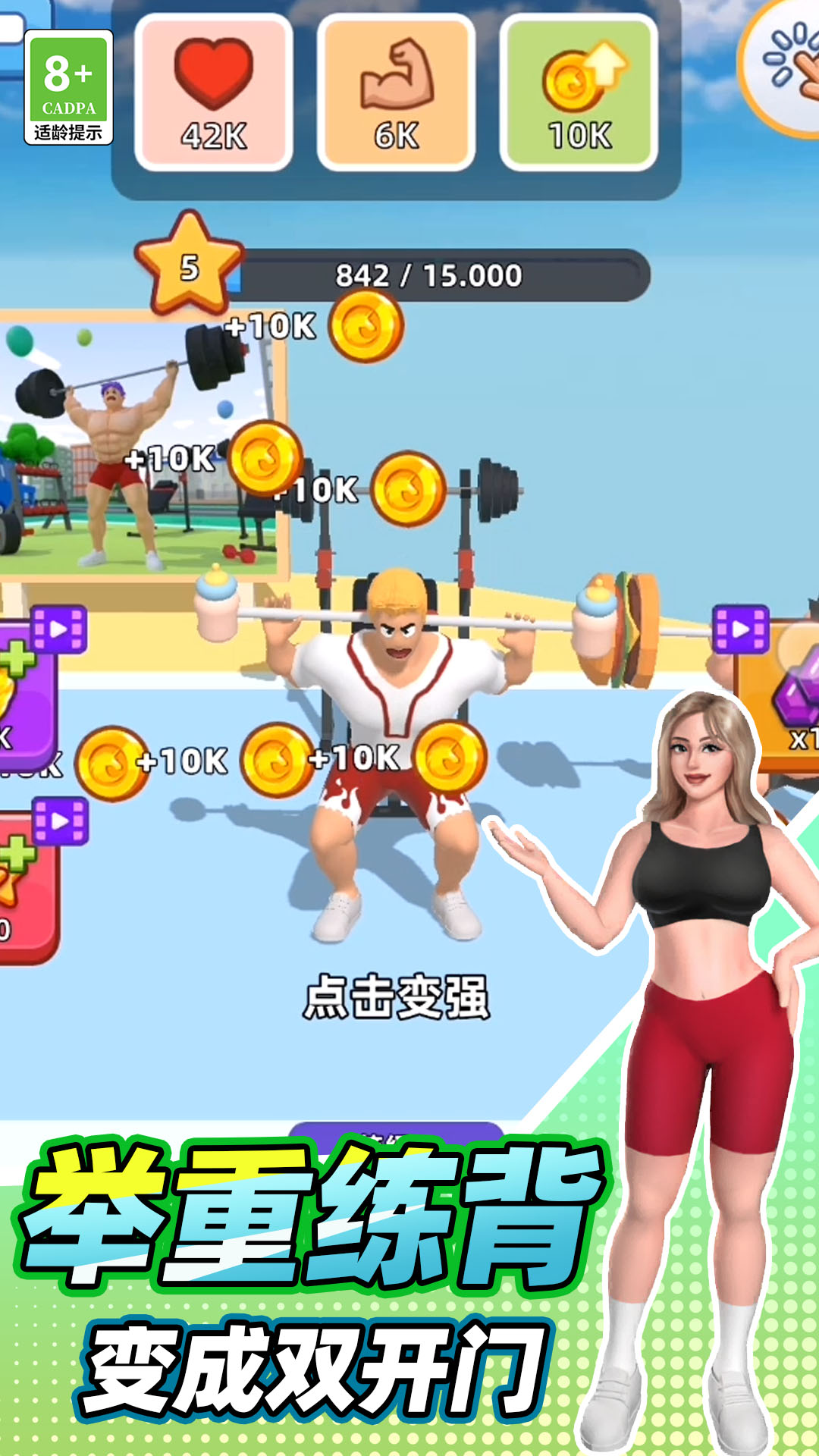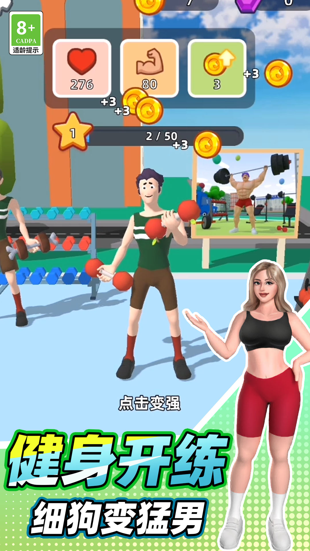 健身小达人游戏是一款充满趣味性的休闲益智类健身游戏,游戏中玩家开始扮演的是一名骨瘦如柴的麻杆角色,然后玩家在游戏中需要自己在家购买各式各样的健身器材来进行各种健身,通过各种各样的健身器材的长期训练,让自己能够成为一名肌肉男,游戏中玩家只要完成一项健身器材的训练都能获取游戏经验和金币,喜欢的玩家千万不要错过了哟。