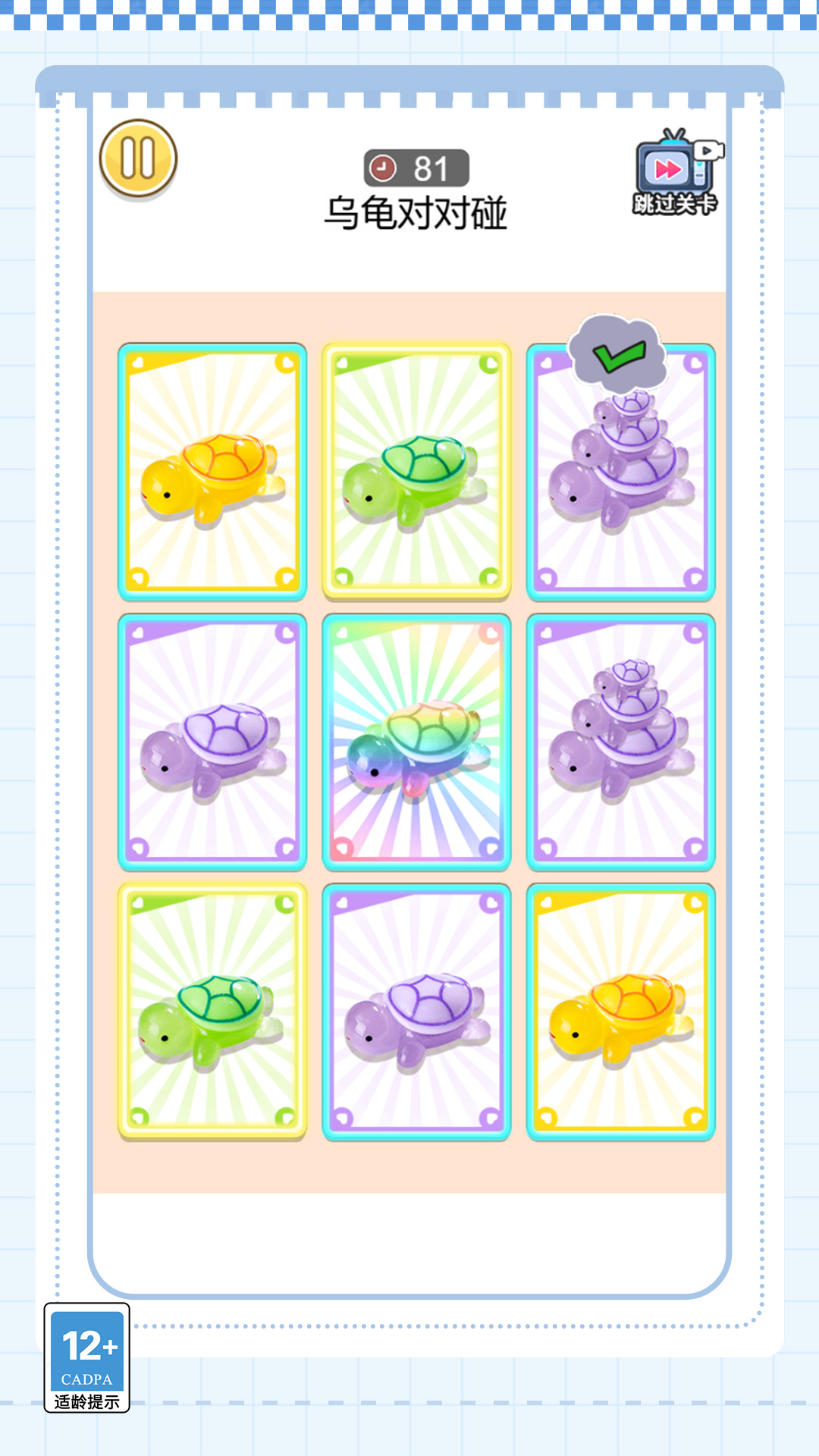 这是一款集益智、休闲与趣味于一体的创新消除类游戏,在该游戏里面围绕着一群十分可爱的乌龟为核心展开,玩家将需要通过将这些乌龟不断的对对碰来消除,从而获得奖励。