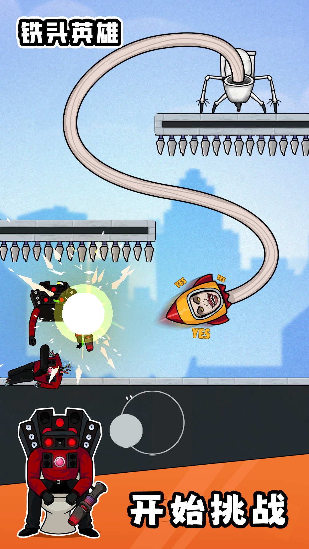 《铁头英雄》是一款冒险闯关类游戏,游戏中,玩家将扮演长脖子马桶人的角色,通过伸缩脖子,用铁头与监控人进行一场激烈的对决。