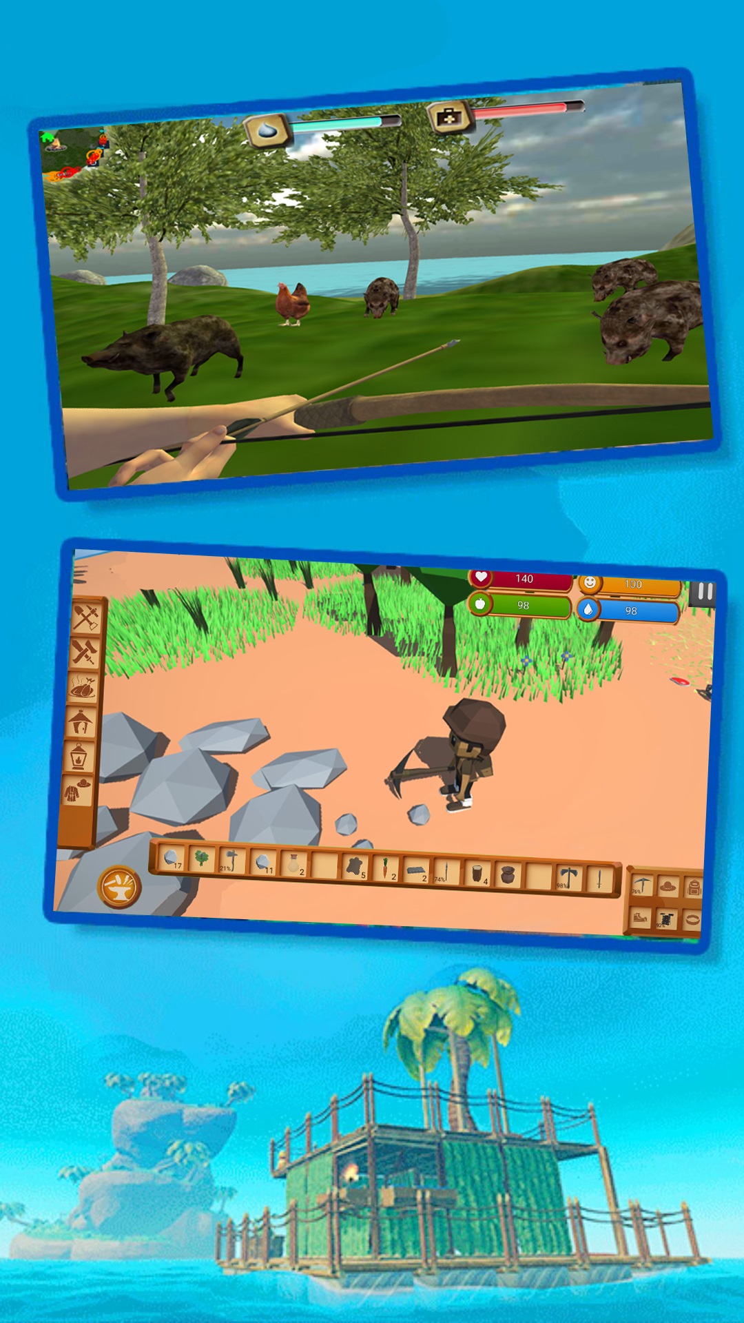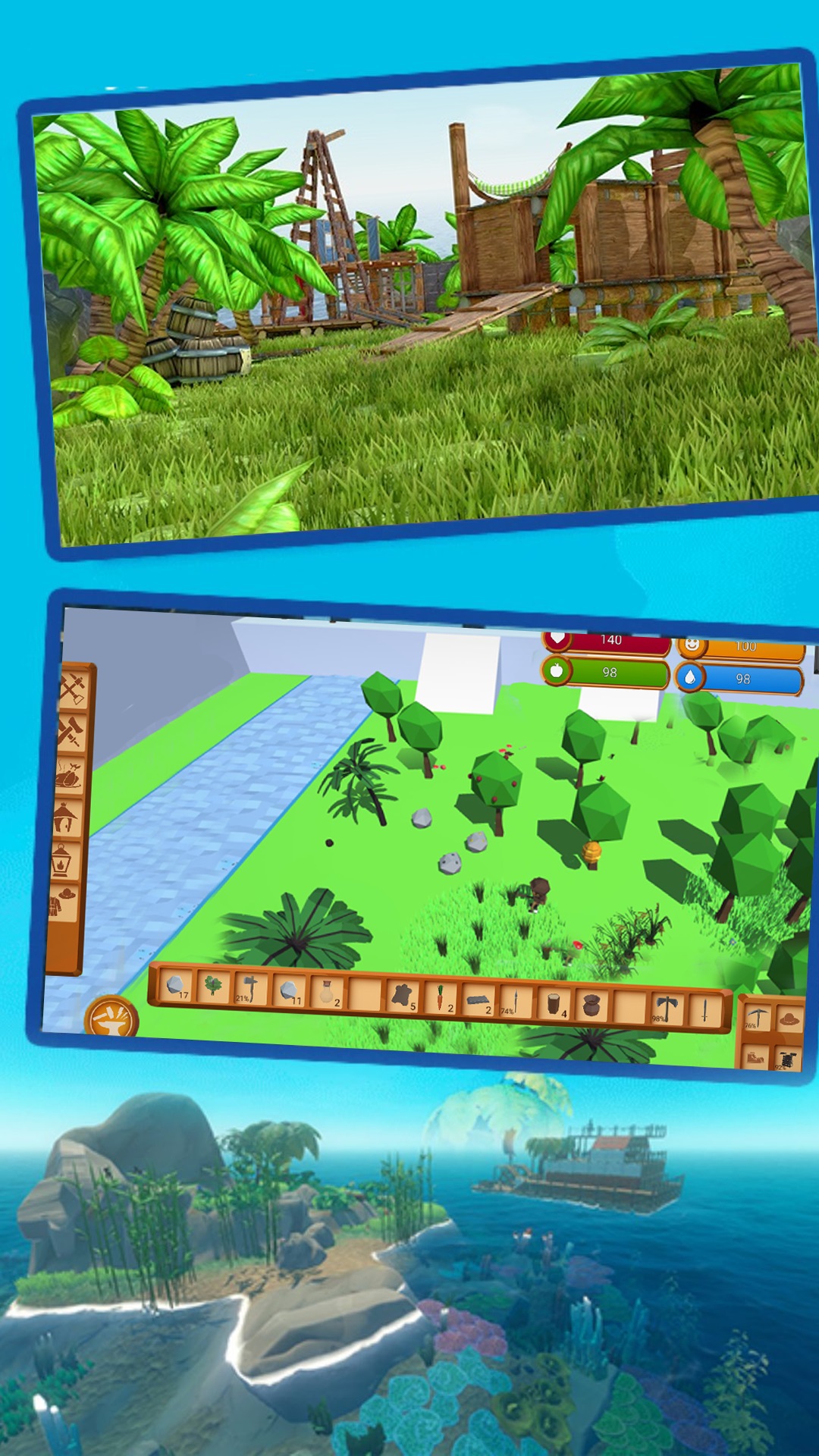 你将出现在一个陌生的岛屿,你没有任何生活必需品,你必须迅速适应荒岛上的生存法则,开启一段全新的生存冒险!为了确保你能在荒岛上生存下来,你需要建造一个属于你的房子,收集材料,制作工具,狩猎岛上的动物作为食物,充足补给,随着你探索的越深,你的敌人就越强大,以防万一,随身携带一件武器进行防御,你不会知道山丘和高大的田野之外有什么在等着你!