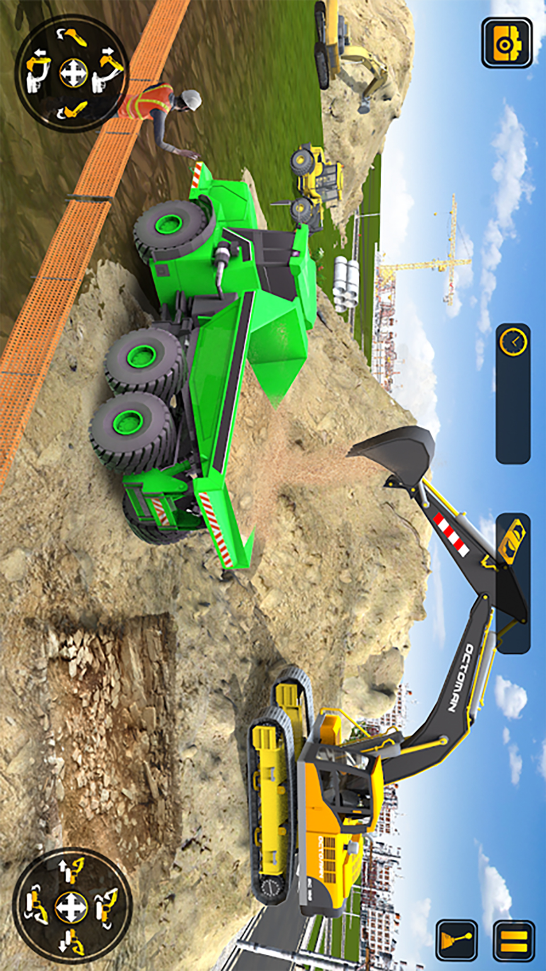 游戏中除了挖掘机之外,在工作现场还有其他各类工程机械可供使用,如履带式推土机、铲车,自卸车等。游戏分为训练与竞赛两种模式,在训练模式中,所有的设备都可以进入尝试。而在竞赛模式会分配给玩家各种任务。