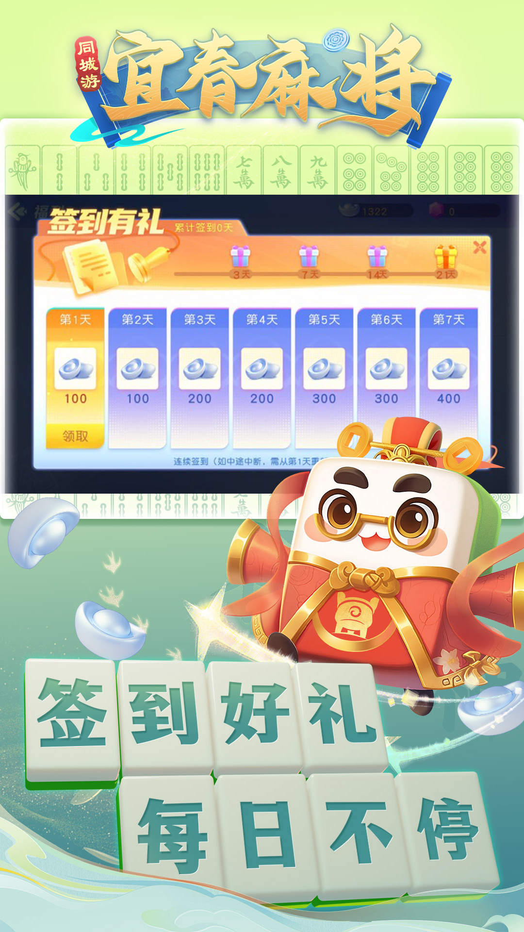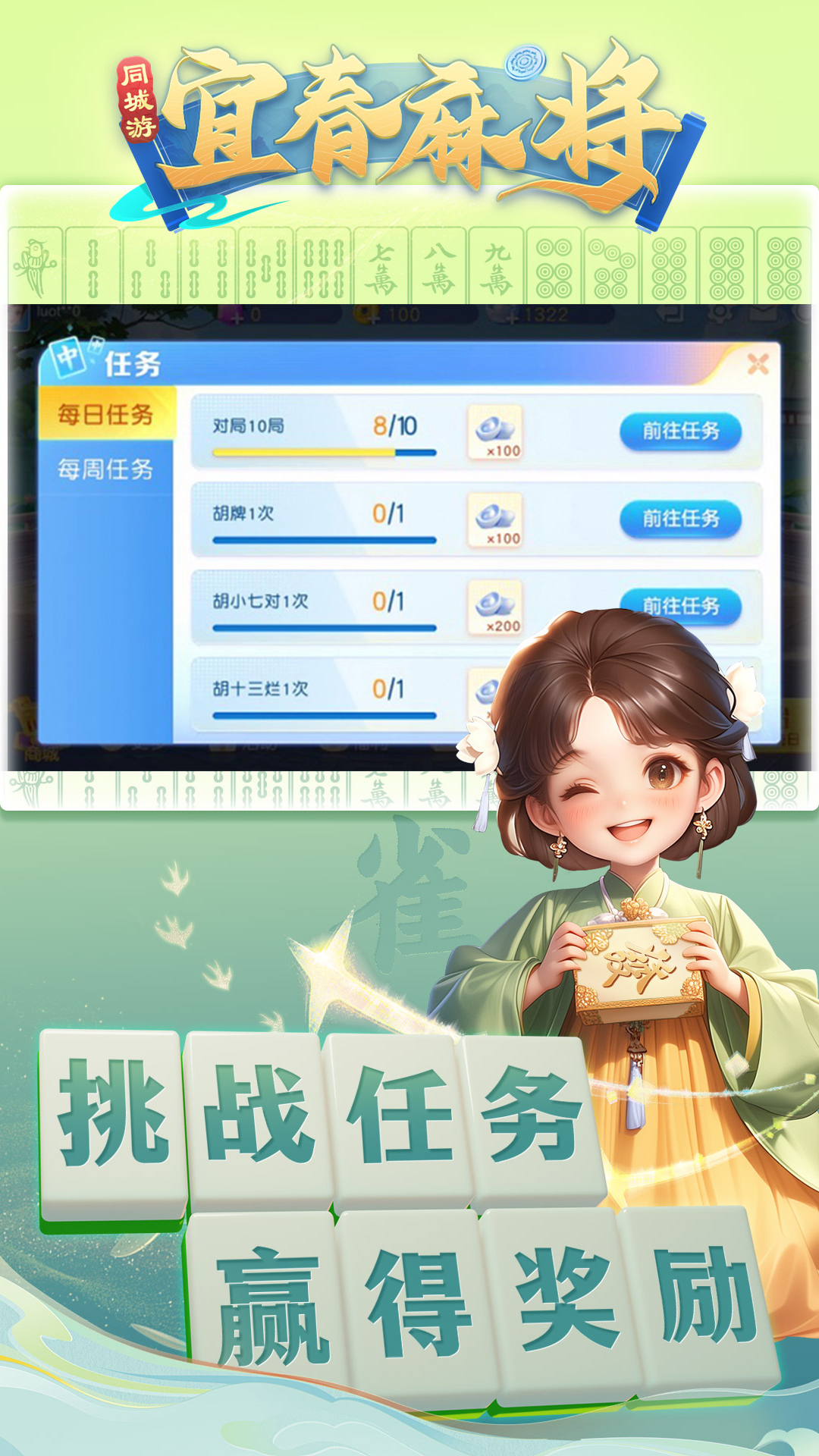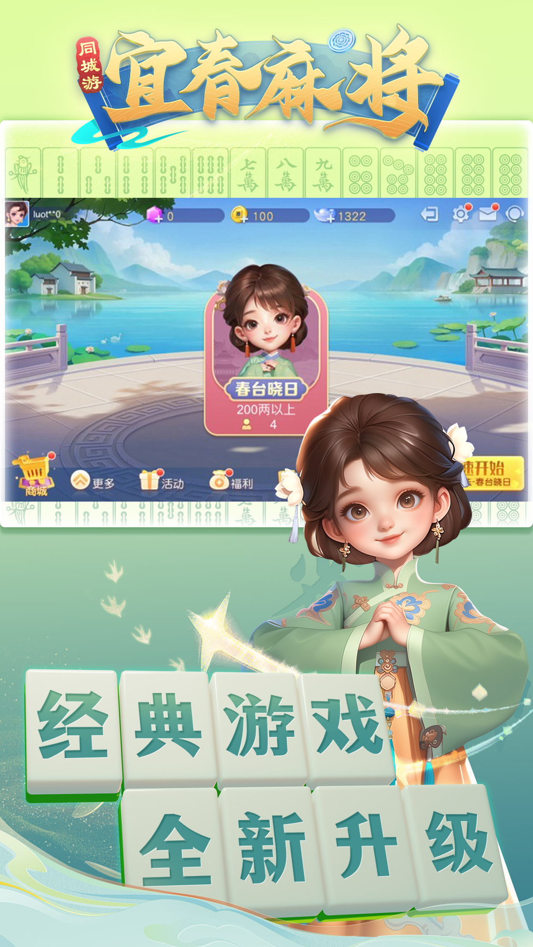 同城游宜春麻将是流行于江西省宜春市的特色麻将,4人同时玩,使用不带花牌的136张牌,四人游戏,可碰,可杠,可吃,字牌也可吃,可放炮胡,支持一炮多响,放冲独付,自摸三家给,有大七对、小七对、门清、清一色、字一色、十三烂、天胡、地胡等计番牌型。