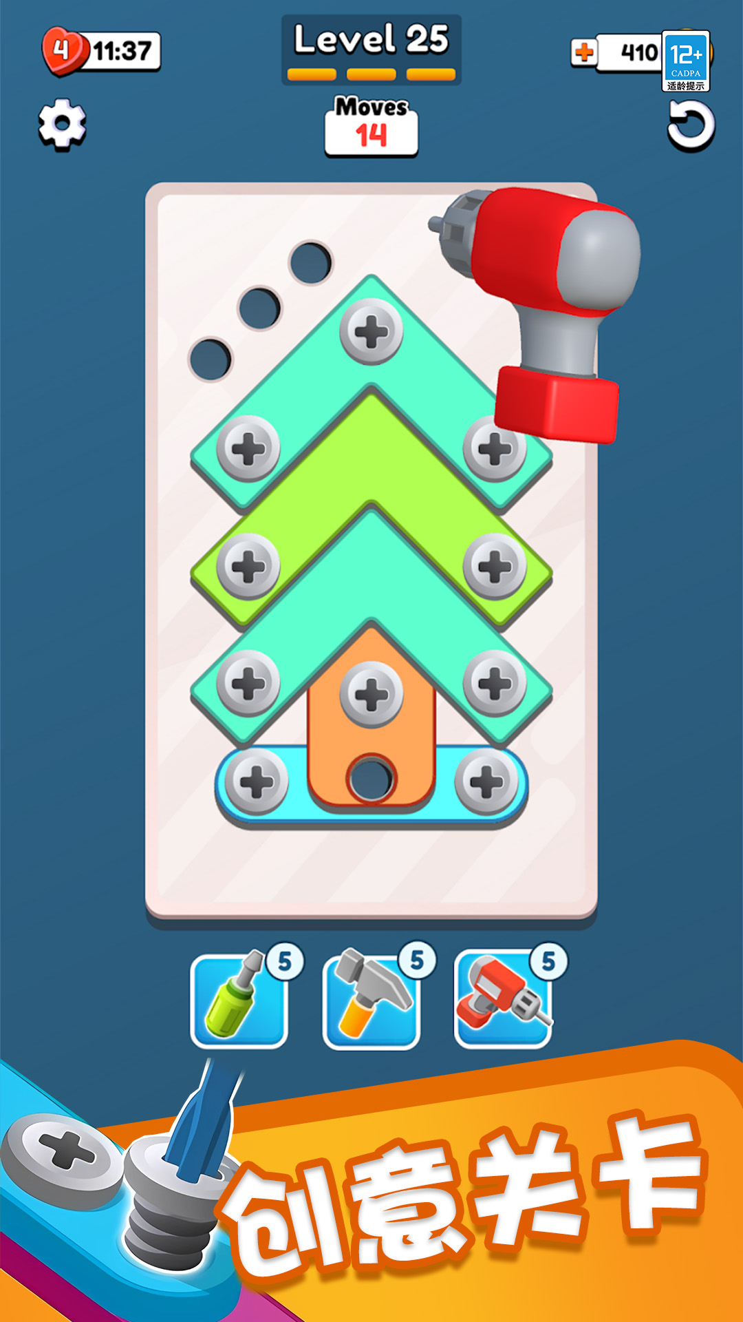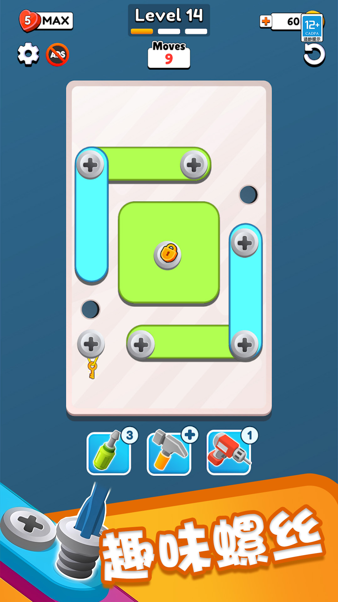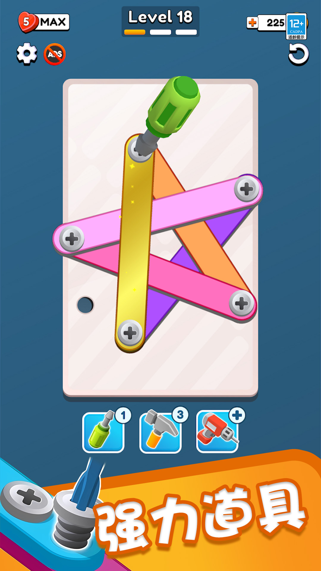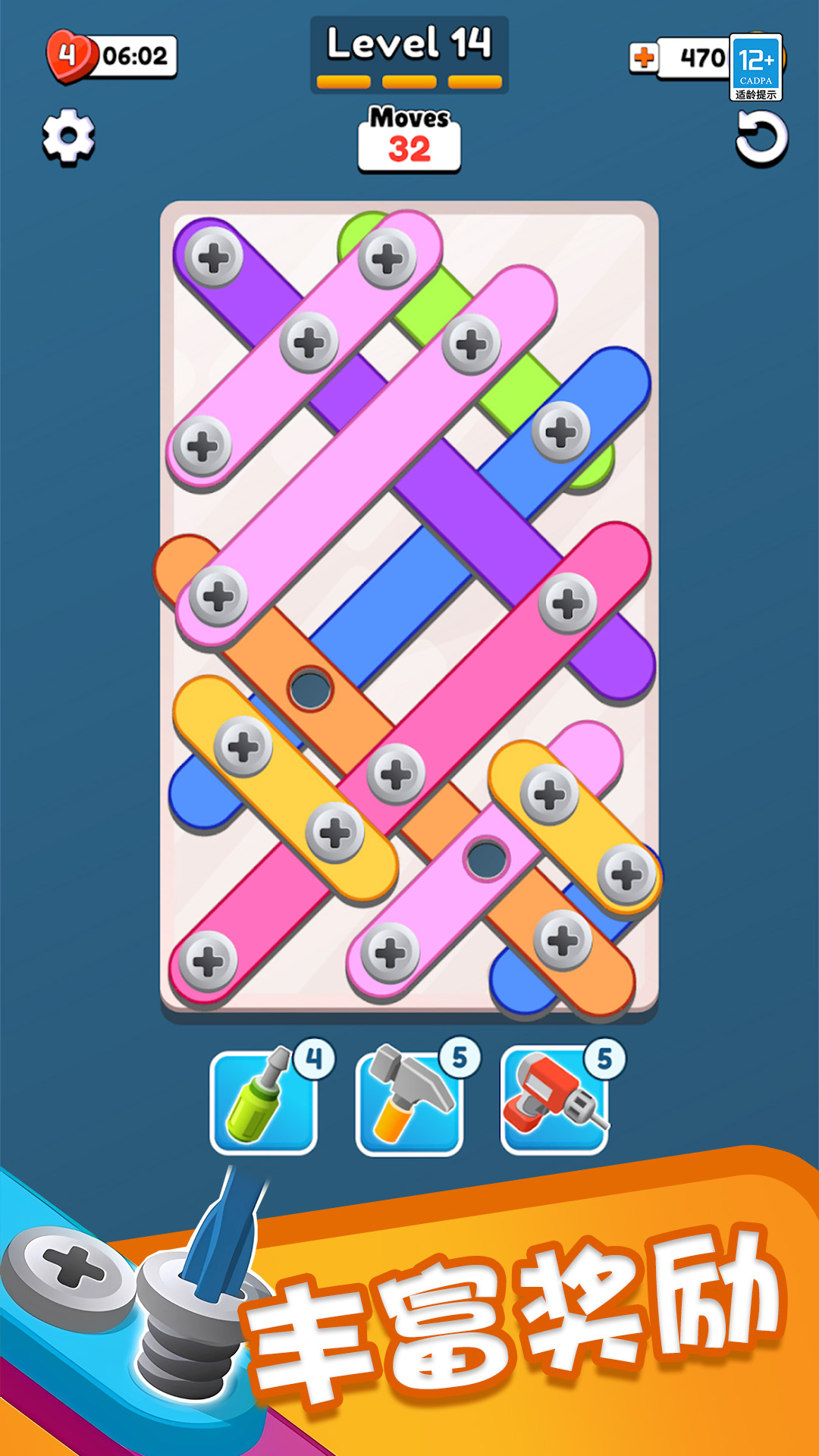 在游戏里,操作非常简单,只需点击每颗螺丝,然后把它们放到板上的其他空位就行。这样操作后,板上的各个图块就会掉落,如此便能赢得关卡胜利,顺利通关。要是你在关卡中碰到了难以解决的问题也不用担心,游戏为玩家提供了道具助力。你既能够选择让任意一颗螺丝被拧走,也可以选择用锤子敲碎任意一块图块。游戏设置了大量的关卡,每个关卡的难度和布局都有所不同,你得凭借自身的观察力和逻辑思维,解开关卡为你设置的重重难题。此外,游戏内还有比赛通道,你可以通过完成比赛相关的内容,收获更多的金币,而这些金币能够被你用来购买道具,从而在关卡挑战中获得更好的成绩。