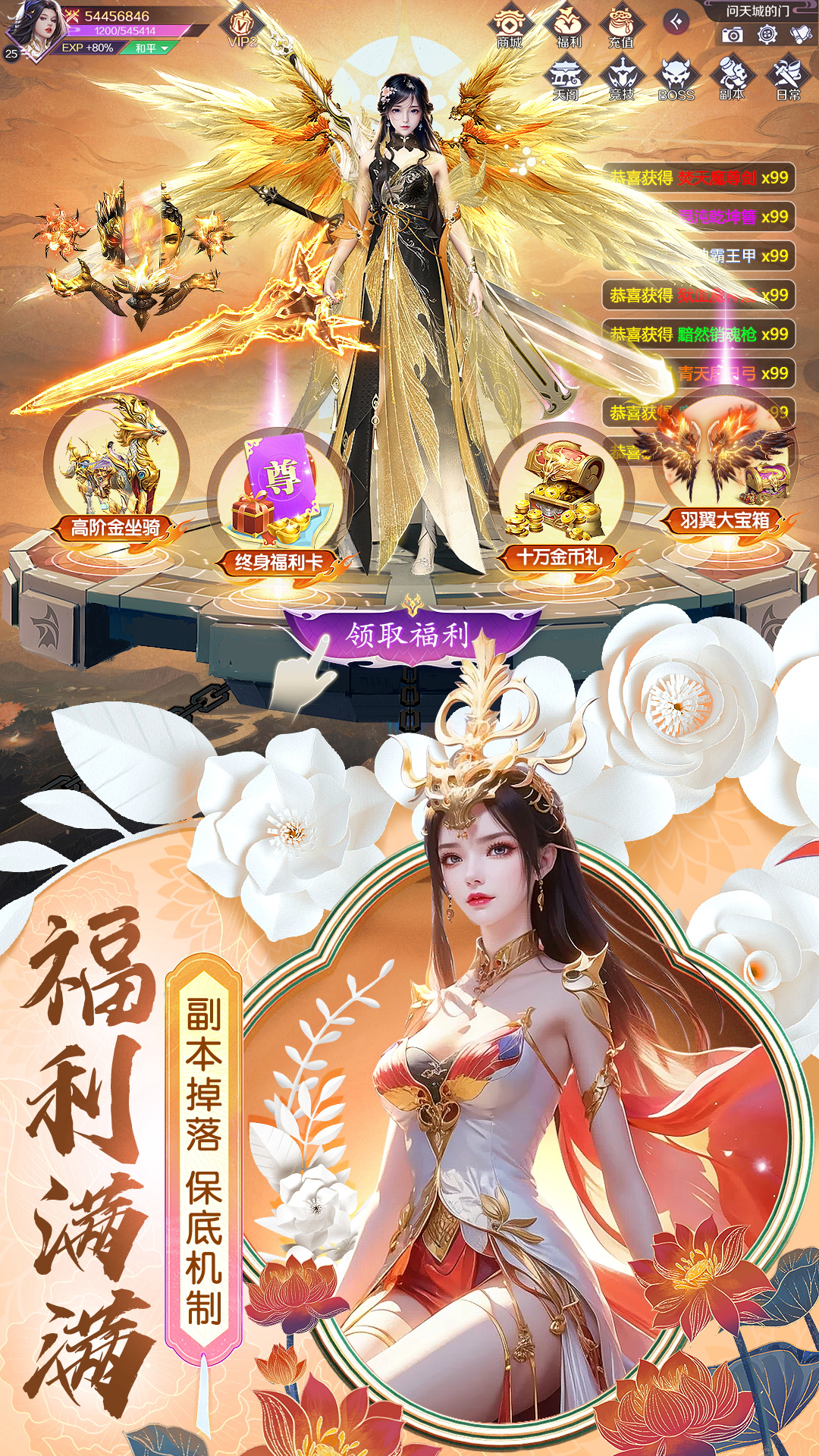 霸榜必领福利:开局输入礼包码VIP666、VIP777、VIP888,绝版套装、满星坐骑一键领取,翅膀,精美时装,即刻拥有,还在等什么?玩它!