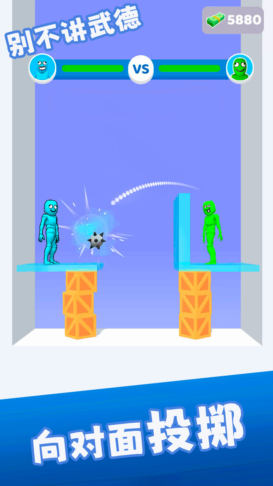 游戏中,玩家将操作一个傻瓜式的布娃娃小人,使用不同的物品,火箭、石头、小刀、保龄球等等都可以,向对面进行投掷攻击。