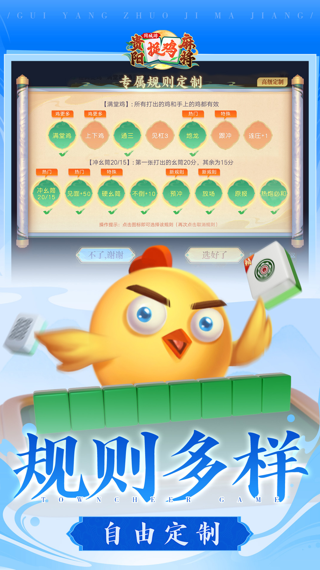 在游戏中可碰杠,不能吃牌,没有庄家设定。除了常见的番型外,还有冲锋鸡、责任鸡、满堂鸡等特色玩法,趣味性十足。除了贵州的捉鸡玩法外,其他很多地区也有不同玩法,像二丁拐、三丁拐玩法以及其他地级市特有的玩法等。