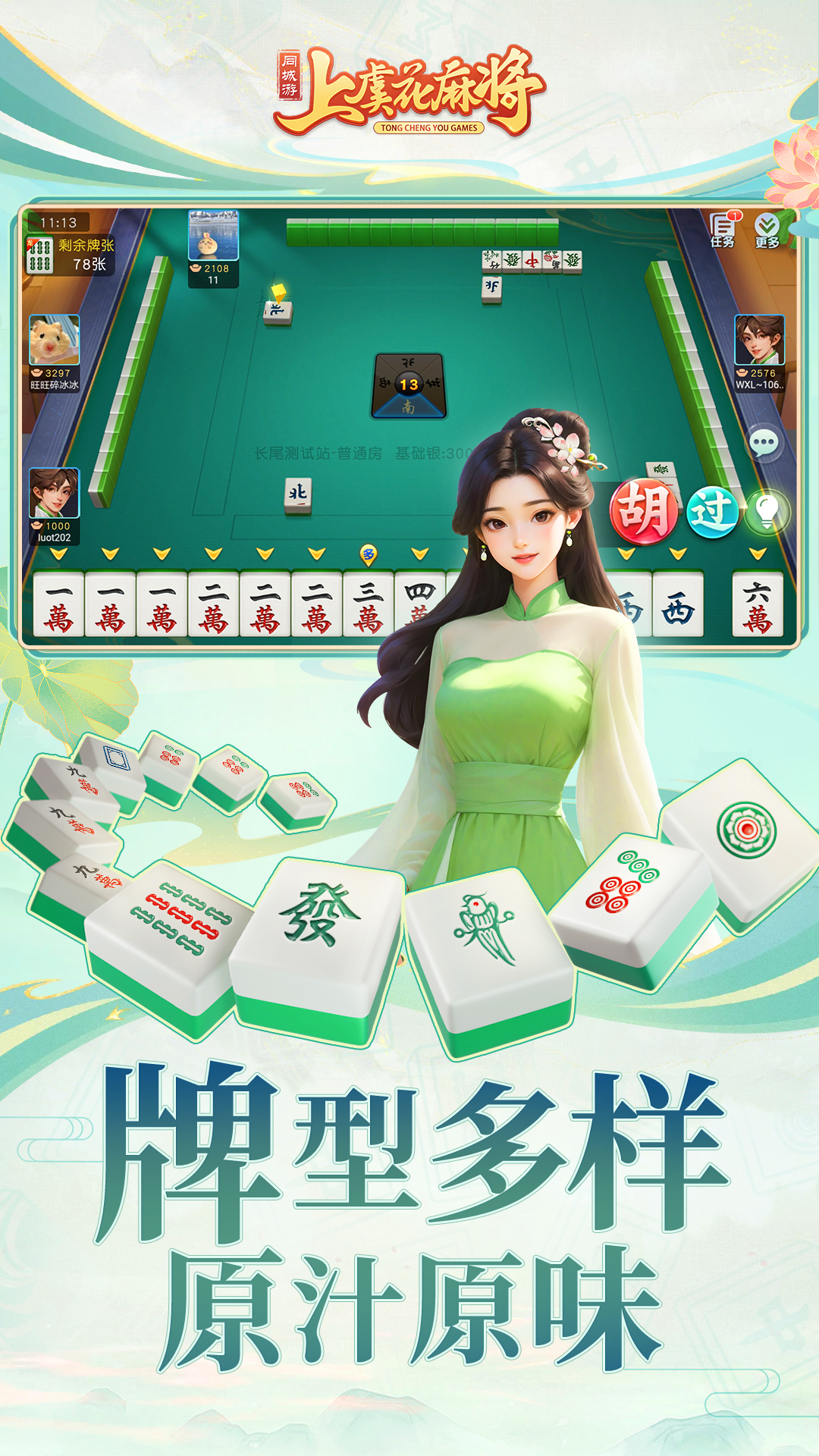 同城游上虞花麻将,又叫有龙强抛头,是一种流行于浙江上虞地区的麻将游戏。同城游上虞花麻将游戏采用四人成局、独立对抗的打法,具有玩法灵活多变、娱乐性强等特点。游戏共144张牌,包含万子牌、筒子牌、条子牌、字牌、花牌。发牌结束后翻龙牌,翻牌加一即为龙,翻花牌则东风做龙。龙可以代替任何牌,但不参与吃碰杠。有玩家胡牌或者抓完最后一张牌,游戏结束。只有大吊的时候可放铳胡,其他都需自摸胡。有龙时必须有番数方可能胡。结算计算胡牌玩家的花数和牌型番数,胡牌牌型包含清一色、杠飞、混一色、碰碰胡、大吊、杠开、四花、飞龙、无龙、爆头。上虞花麻将的特色就是对有龙胡牌做了限制,有龙的情况下必需抛头才可以胡,这样就避免了大家胡垃圾胡的机会,大大增加了做大牌的机会和刺激性。