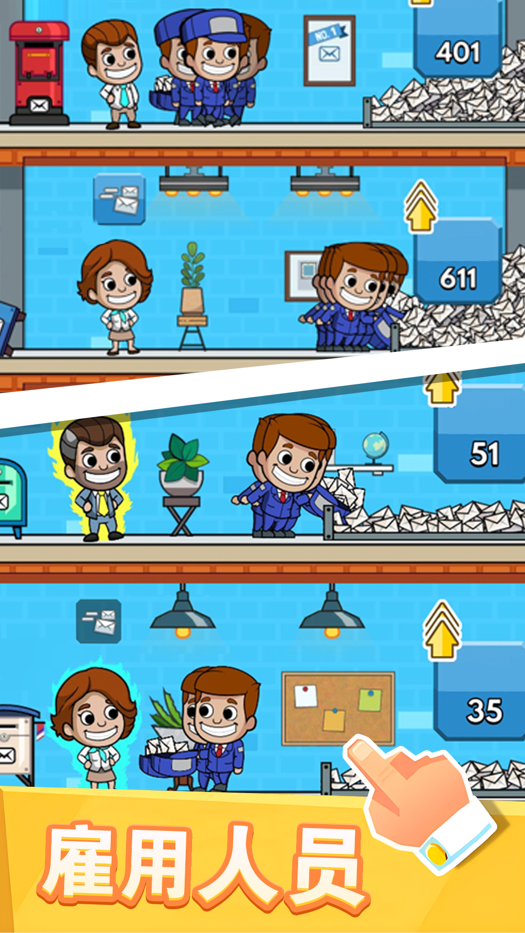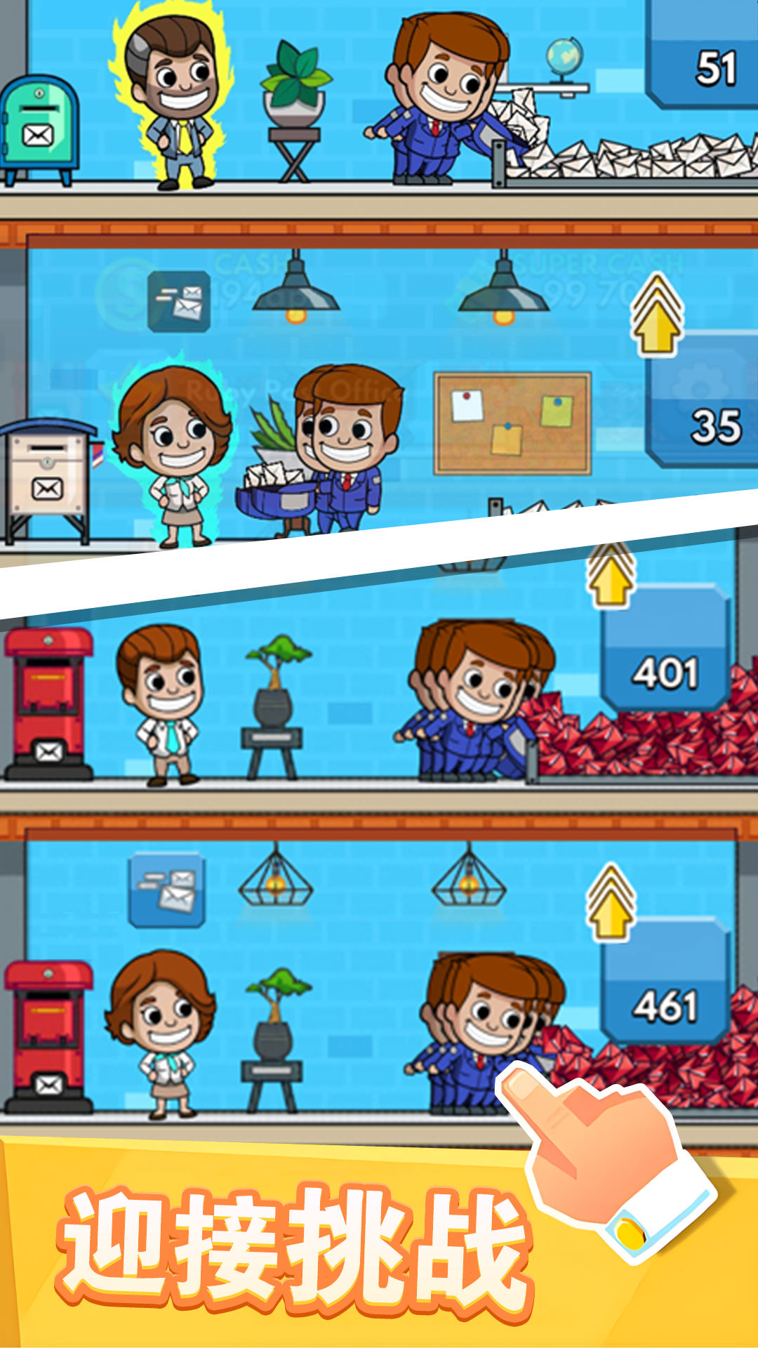 这是一款令人上瘾的闲置放置游戏,玩家将扮演一个邮局管理员,准备好在这款闲置游戏中建立自己的邮件业务,成为闲置邮件大亨了吗?工作流程自动化,即使在离线状态下也能收取闲置现金收入!通过管理邮局和闲置利润,成为邮件大亨!扩展你的帝国,让经理们为你的帝国助一臂之力,使你的邮局工作流程自动化!迎接挑战,探索邮局经营策略,尽可能赚取更多利润!