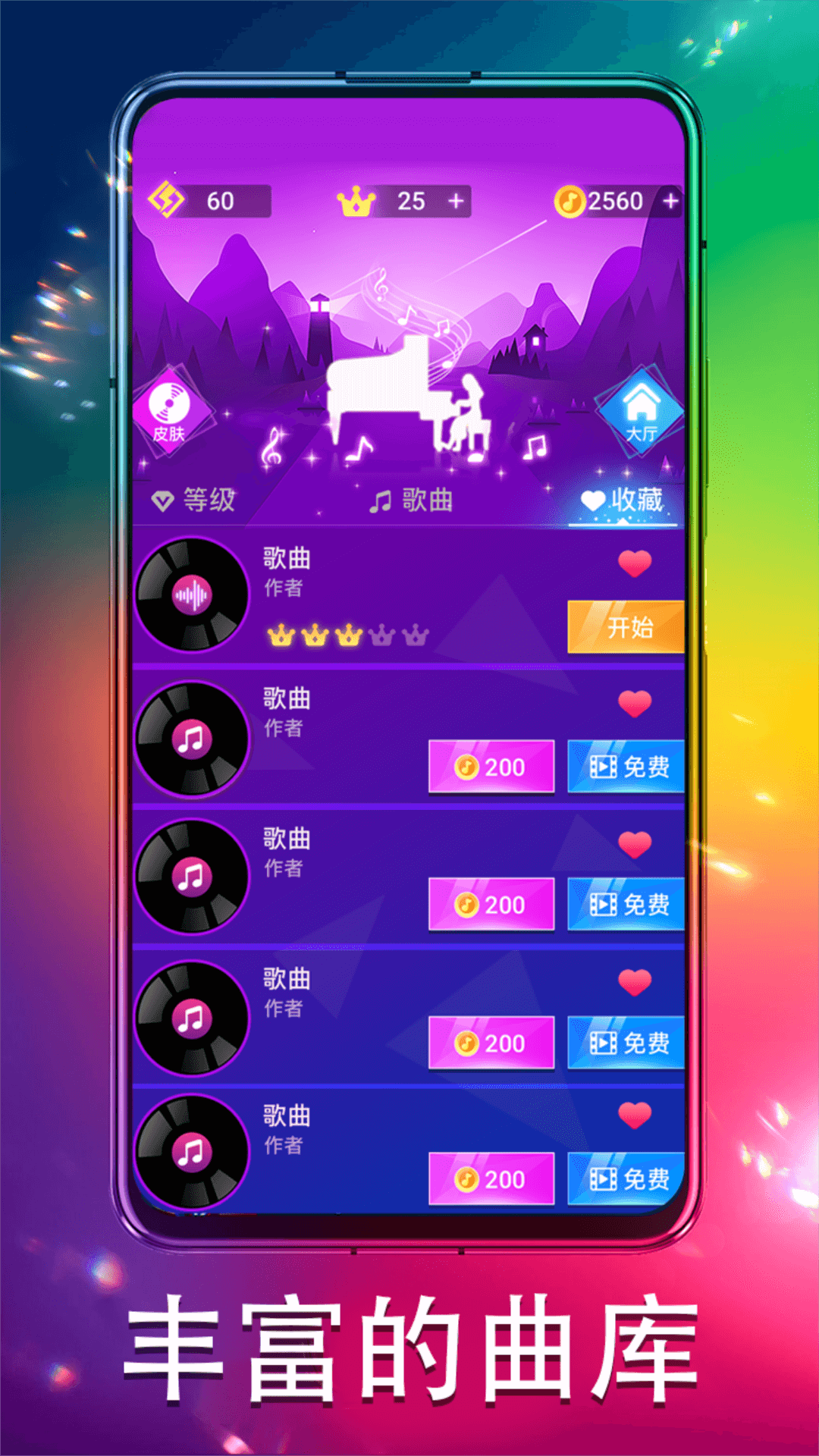 玩家选择喜欢的歌曲跟随着音乐节奏来弹奏钢琴块!