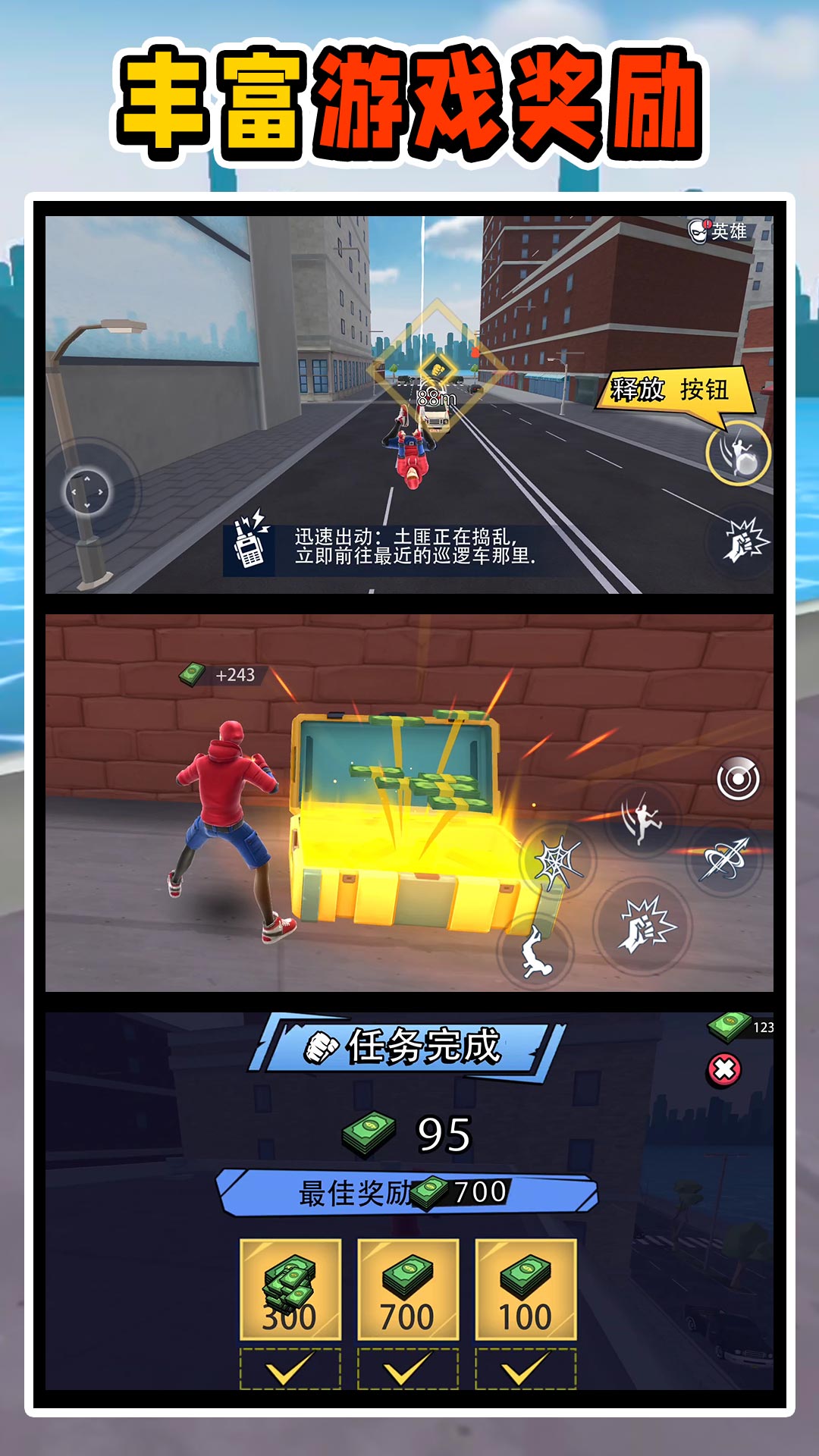 守护你的城市,不让坏人破坏这片地方。解锁各类炫酷技能,自由穿梭都市间,与黑恶势力做斗争,阻止一切不美好