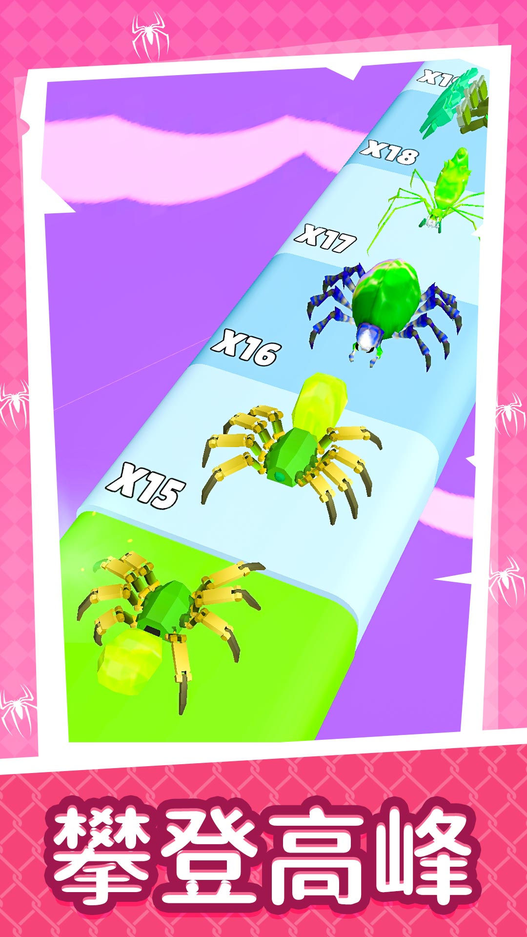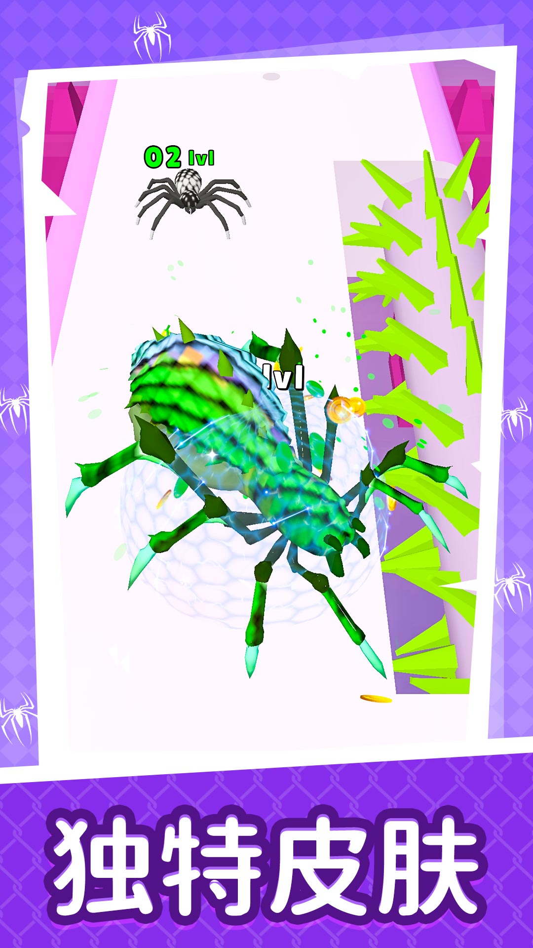 将人气极高的跑酷与乱斗玩法相融合。玩家一边通过跑酷提升蜘蛛的等级,另一边在乱斗关卡中与其他玩家展开激烈厮杀。不断养成壮大可爱的蜘蛛,将小小的蜘蛛培养成蜘蛛世界的统治者。全3D的蜘蛛造型,等级变化后带来的外观改变,简单的操作,特色的玩法,巧妙的创新,带给玩家多样性的游戏体验。