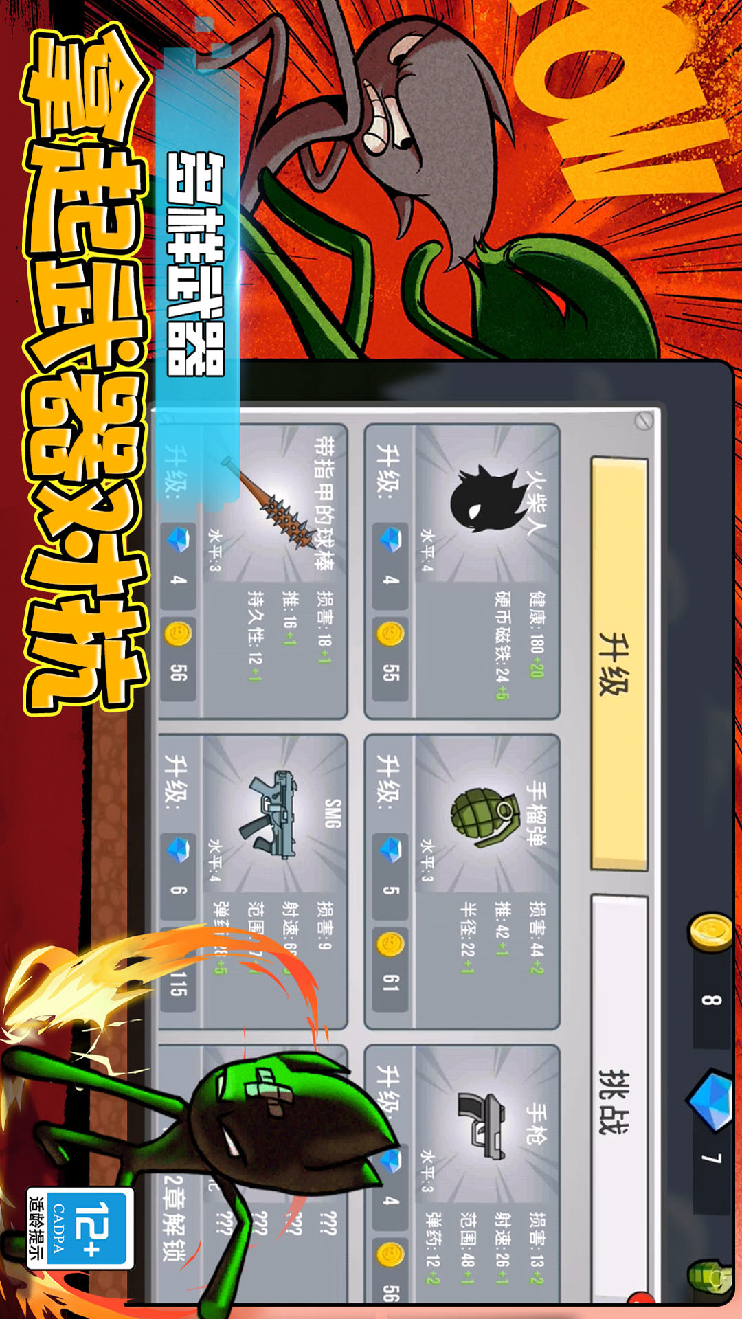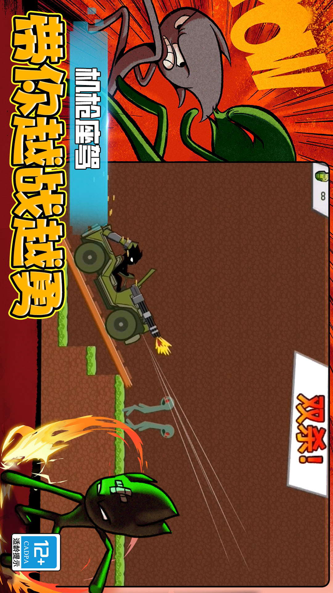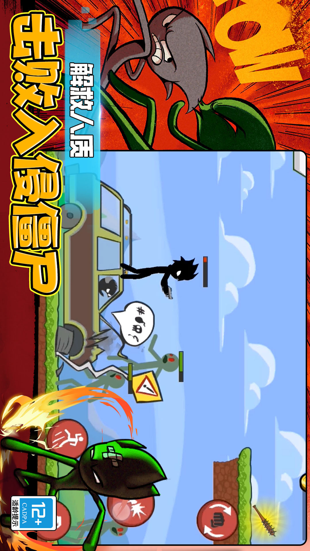 这是一款以火柴人为题材打造的竞技类手游,在游戏中,你将扮演一位名叫小智的火柴人战士,为了生存下去,必须勇敢地穿越复杂的地形,山地、森林,水底等等,从而抵达目的地。途中,你会碰到游走着的丧尸群,你可以选择消灭它们,也可以选择避开它们。前期武器没有足够强大的情况下,选择避开或许是不错的选择。