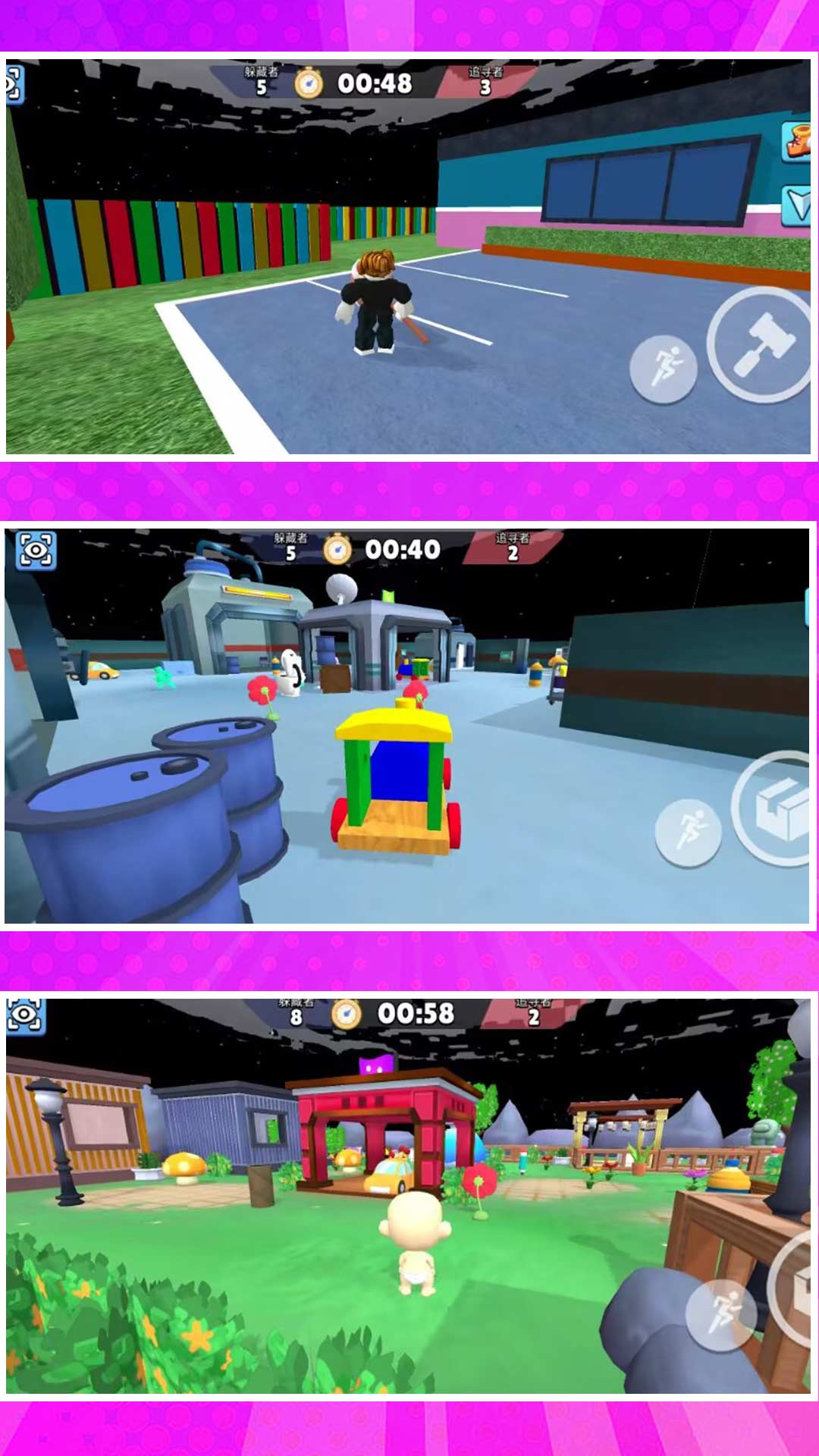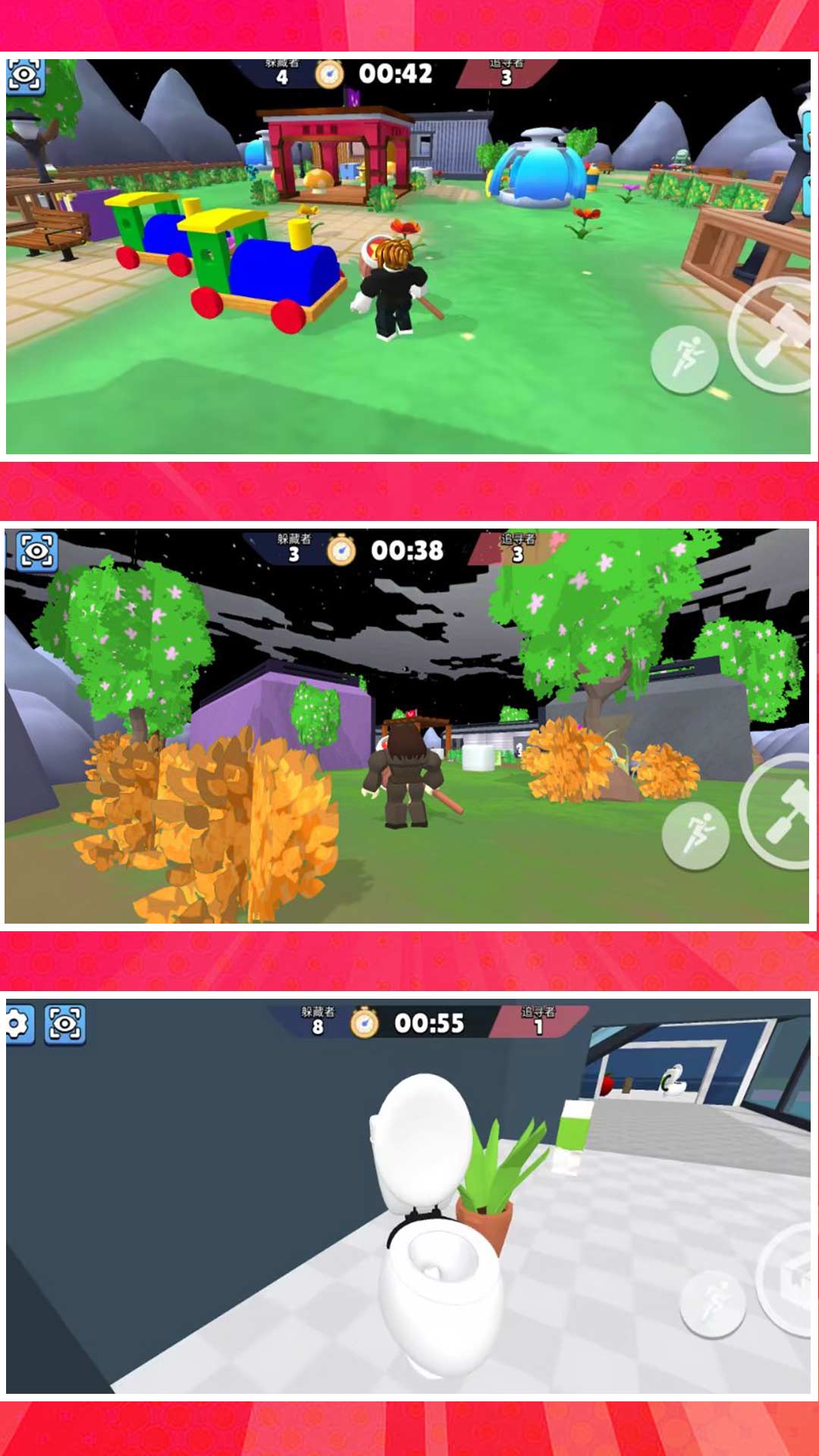 《全民跑一跑》是一款好玩的休闲游戏,游戏画像采用像素风格。操作简单,玩家可以变身追击者也可以变身逃脱者,有两种不同的玩法,追击者击败所有逃脱者即可取得胜利,逃脱者需要伪装成各种道具,存活到时间结束即可胜利